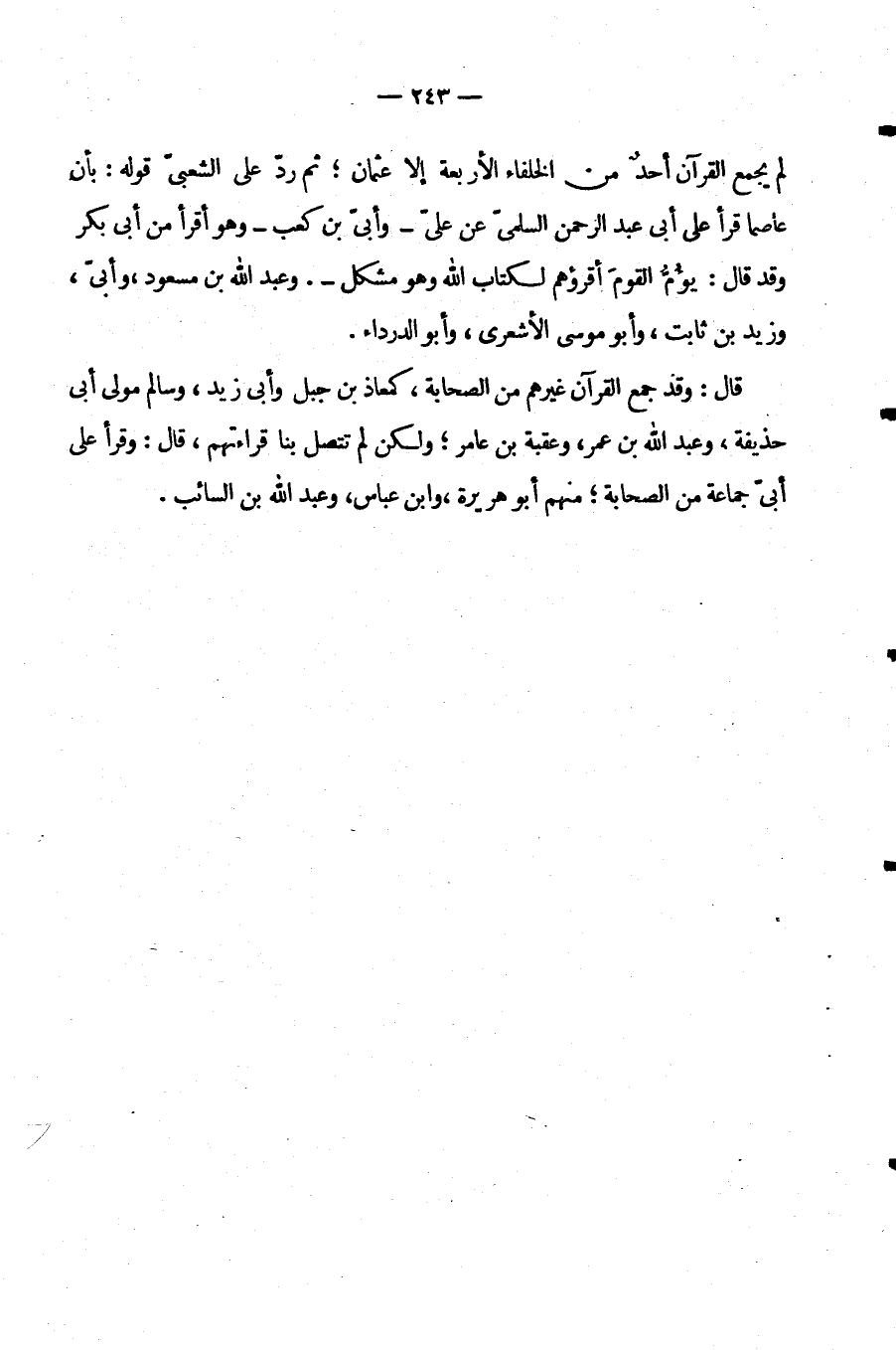 قَالَ: وَقَدْ جَمَعَ الْقُرْآنَ غَيْرُهُمْ مِنَ الصَّحَابَةِ كَمُعَاذِ بْنِ جَبَلٍ وَأَبِي زَيْدٍ وَسَالِمٍ مَوْلَى أَبِي حُذَيْفَةَ وَعَبْدِ اللَّهِ بْنِ عُمَرَ وَعُقْبَةَ بْنِ عَامِرٍ وَلَكِنْ لَمْ تَتَّصِلْ بِنَا قِرَاءَتُهُمْ قَالَ وَقَرَأَ عَلَى أُبَيٍّ جَمَاعَةٌ مِنَ الصَّحَابَةِ مِنْهُمْ أَبُو هُرَيْرَةَ وَابْنُ عَبَّاسٍ وَعَبْدُ اللَّهِ بن السائب