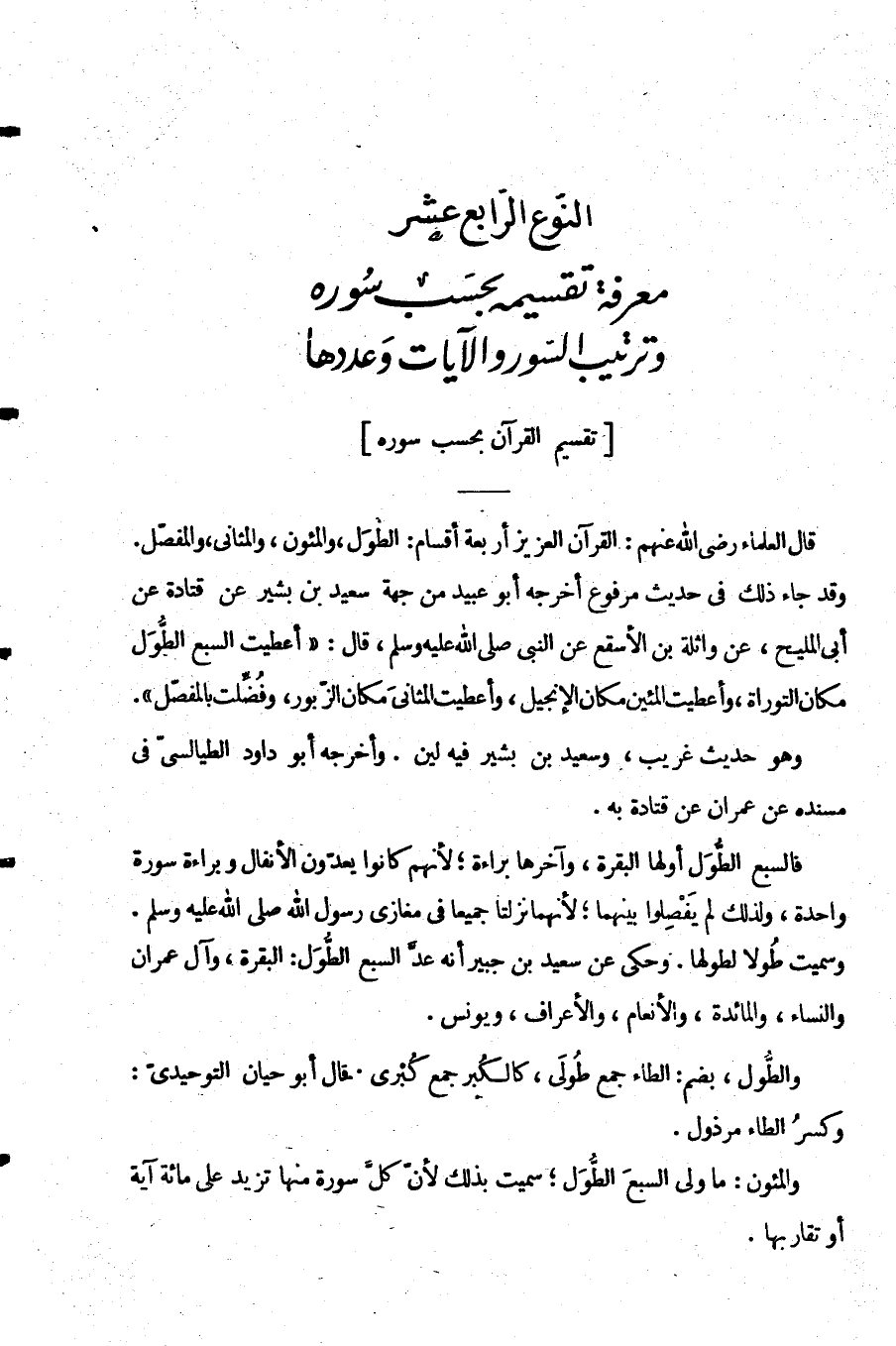 قَالَ الْعُلَمَاءُ رَضِيَ اللَّهُ عَنْهُمْ الْقُرْآنُ الْعَزِيزُ أَرْبَعَةُ أَقْسَامٍ الطُّوَلُ وَالْمِئُونَ وَالْمَثَانِي وَالْمُفَصَّلُ وَقَدْ جَاءَ ذَلِكَ فِي حَدِيثٍ مَرْفُوعٍ أَخْرَجَهُ أَبُو عُبَيْدٍ مِنْ جِهَةِ سَعِيدِ بْنِ بَشِيرٍ عَنْ قَتَادَةَ عَنْ أَبِي الْمَلِيحِ عَنْ وَاثِلَةَ بْنِ الْأَسْقَعِ عَنِ النَّبِيِّ صَلَّى اللَّهُ عَلَيْهِ وَسَلَّمَ قَالَ: "أُعْطِيتُ السَّبْعَ الطُّوَلَ مَكَانَ التَّوْرَاةِ وَأُعْطِيتُ الْمِئِينَ مَكَانَ الْإِنْجِيلِ وَأُعْطِيتُ الْمَثَانِيَ مَكَانَ الزَّبُورِ وَفُضِّلْتُ بِالْمُفَصَّلِ"