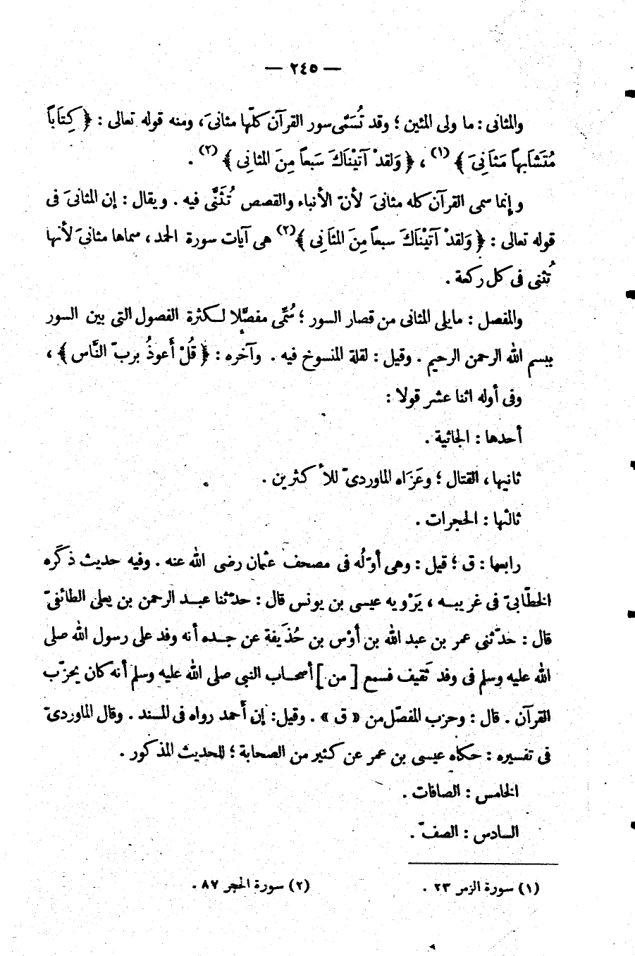 وَالْمُفَصَّلُ: مَا يَلِي الْمَثَانِيَ مِنْ قِصَارِ السُّوَرِ سُمِّيَ مُفَصِّلًا لِكَثْرَةِ الفصول التي بين السور ببسم اللَّهِ الرَّحْمَنِ الرَّحِيمِ وَقِيلَ لِقِلَّةِ الْمَنْسُوخِ فِيهِ وَآخِرُهُ: {قُلْ أَعُوذُ بِرَبِّ النَّاسِ}