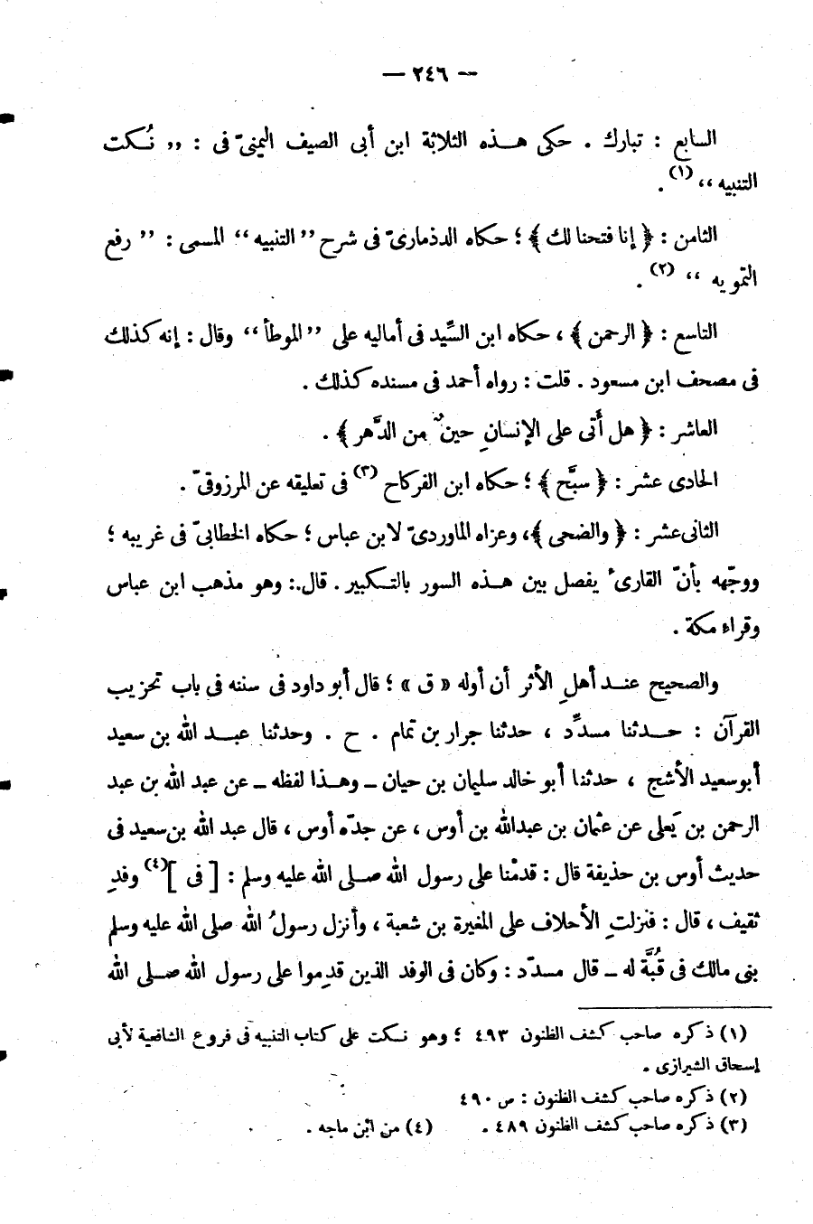 وَالصَّحِيحُ عِنْدَ أَهْلِ الْأَثَرِ أَنَّ أَوَّلَهُ ق قَالَ أَبُو دَاوُدَ فِي سُنَنِهِ فِي بَابِ تَحْزِيبِ الْقُرْآنِ حَدَّثَنَا مُسَدَّدٌ حَدَّثَنَا جرار بْنُ تَمَّامٍ ح وَحَدَّثَنَا عَبْدُ اللَّهِ بْنُ سَعِيدٍ أَبُو سَعِيدٍ الْأَشَجُّ حَدَّثَنَا أَبُو خَالِدٍ سُلَيْمَانُ بْنُ حَيَّانَ وَهَذَا لَفْظُهُ عَنْ عَبْدِ الله بن عبد الرحمن يَعْلَى عَنْ عُثْمَانَ بْنِ عَبْدِ اللَّهِ بْنِ أَوْسٍ عَنْ جَدِّهِ أَوْسٍ قَالَ عَبْدُ اللَّهِ بْنُ سَعِيدٍ فِي حَدِيثِ أَوْسِ بْنِ حُذَيْفَةَ قَالَ قَدِمْنَا عَلَى رَسُولِ اللَّهِ صَلَّى اللَّهُ عَلَيْهِ وَسَلَّمَ فِي وَفْدِ ثَقِيفٍ قَالَ فَنَزَلَتِ الْأَحْلَافُ عَلَى الْمُغِيرَةِ بْنِ شُعْبَةَ وَأَنْزَلَ رَسُولُ اللَّهِ صَلَّى اللَّهُ عَلَيْهِ وَسَلَّمَ بَنِي مَالِكٍ فِي قُبَّةٍ لَهُ قَالَ مُسَدَّدٌ وَكَانَ فِي الْوَفْدِ الَّذِينَ قَدِمُوا عَلَى رَسُولِ اللَّهِ صَلَّى اللَّهُ عَلَيْهِ وَسَلَّمَ