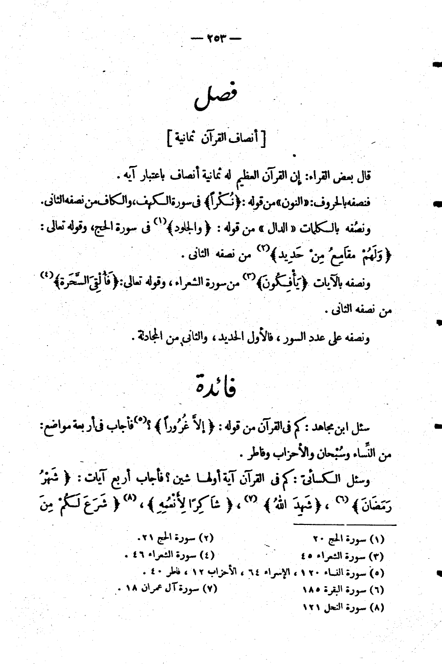 قَالَ بَعْضُ الْقُرَّاءِ إِنَّ الْقُرْآنَ الْعَظِيمَ لَهُ ثمانية أنصاف باعتبار آية