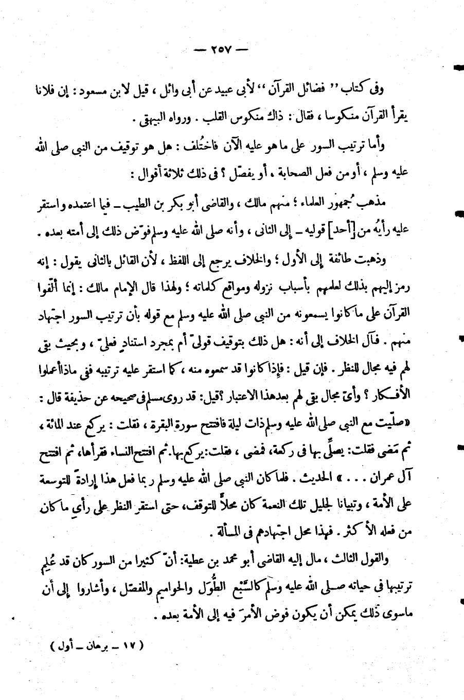 وَذَهَبَتْ طَائِفَةٌ إِلَى الْأَوَّلِ وَالْخِلَافُ يَرْجِعُ إِلَى اللَّفْظِ لِأَنَّ الْقَائِلَ بِالثَّانِي يَقُولُ: إِنَّهُ رَمَزَ إِلَيْهِمْ بِذَلِكَ لِعِلْمِهِمْ بِأَسْبَابِ نُزُولِهِ وَمَوَاقِعِ كَلِمَاتِهِ وَلِهَذَا قَالَ الْإِمَامُ مَالِكٌ إِنَّمَا أَلَّفُوا الْقُرْآنَ عَلَى مَا كَانُوا يَسْمَعُونَهُ مِنَ النَّبِيِّ صَلَّى اللَّهُ عَلَيْهِ وَسَلَّمَ مَعَ قَوْلِهِ بِأَنَّ تَرْتِيبَ السُّوَرِ اجْتِهَادٌ مِنْهُمْ فَآلَ الْخِلَافُ إِلَى أَنَّهُ هَلْ ذَلِكَ بِتَوْقِيفٍ قَوْلِيٍّ أَمْ بِمُجَرَّدِ اسْتِنَادٍ فِعْلِيٍّ وَبِحَيْثُ بَقِيَ لَهُمْ فِيهِ مَجَالٌ لِلنَّظَرِ فَإِنْ قِيلَ فَإِذَا كَانُوا قَدْ سَمِعُوهُ مِنْهُ كَمَا اسْتَقَرَّ عَلَيْهِ تَرْتِيبُهُ فَفِي مَاذَا أَعْمَلُوا الْأَفْكَارَ وَأَيُّ مَجَالٍ بَقِيَ لَهُمْ بَعْدَ هَذَا الِاعْتِبَارِ قِيلَ قَدْ رَوَى مُسْلِمٌ فِي صَحِيحِهِ عَنْ حُذَيْفَةَ قَالَ: "صَلَّيْتُ مَعَ النَّبِيِّ صَلَّى اللَّهُ عَلَيْهِ وَسَلَّمَ ذَاتَ لَيْلَةٍ فَافْتَتَحَ سُورَةَ الْبَقَرَةِ فَقُلْتُ يَرْكَعُ عِنْدَ الْمِائَةِ ثُمَّ مَضَى فَقُلْتُ يُصَلِّي بِهَا فِي رَكْعَةٍ فَمَضَى فَقُلْتُ يَرْكَعُ بِهَا ثُمَّ افْتَتَحَ النِّسَاءَ فَقَرَأَهَا ثُمَّ افْتَتَحَ آلَ عِمْرَانَ" الْحَدِيثَ فَلَمَّا كَانَ النَّبِيُّ صَلَّى اللَّهُ عَلَيْهِ وَسَلَّمَ رُبَّمَا فَعَلَ هَذَا إِرَادَةً لِلتَّوْسِعَةِ عَلَى الْأُمَّةِ وَتِبْيَانًا لِجَلِيلِ تِلْكَ النِّعْمَةِ كَانَ مَحَلًّا لِلتَّوَقُّفِ حَتَّى اسْتَقَرَّ النَّظَرُ عَلَى رَأْيِ مَا كَانَ مِنْ فِعْلِهِ الْأَكْثَرُ فَهَذَا مَحَلُّ اجْتِهَادِهِمْ فِي الْمَسْأَلَةِ.