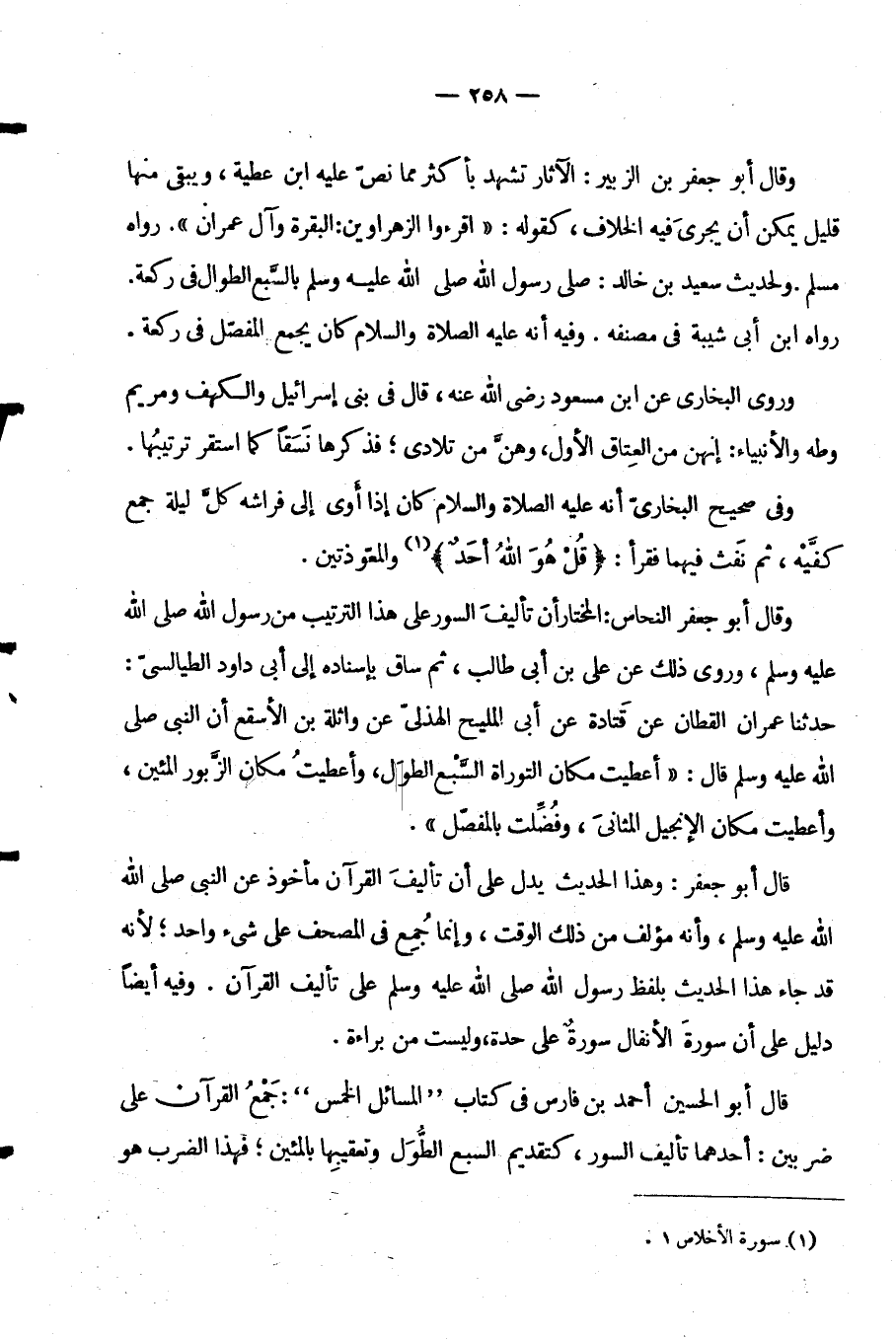 قَالَ أَبُو جَعْفَرٍ وَهَذَا الْحَدِيثُ يَدُلُّ عَلَى أَنَّ تَأْلِيفَ الْقُرْآنِ مَأْخُوذٌ عَنِ النَّبِيِّ صَلَّى اللَّهُ عَلَيْهِ وَسَلَّمَ وَأَنَّهُ مُؤَلَّفٌ مِنْ ذَلِكَ الْوَقْتِ وَإِنَّمَا جُمِعَ فِي الْمُصْحَفِ عَلَى شَيْءٍ وَاحِدٍ لِأَنَّهُ قَدْ جَاءَ هَذَا الْحَدِيثُ بِلَفْظِ رَسُولِ اللَّهِ صَلَّى اللَّهُ عَلَيْهِ وَسَلَّمَ عَلَى تَأْلِيفِ الْقُرْآنِ وَفِيهِ أَيْضًا دَلِيلٌ عَلَى أَنَّ سُورَةَ الْأَنْفَالِ سُورَةٌ عَلَى حِدَةٍ وَلَيْسَتْ مِنْ بَرَاءَةَ
