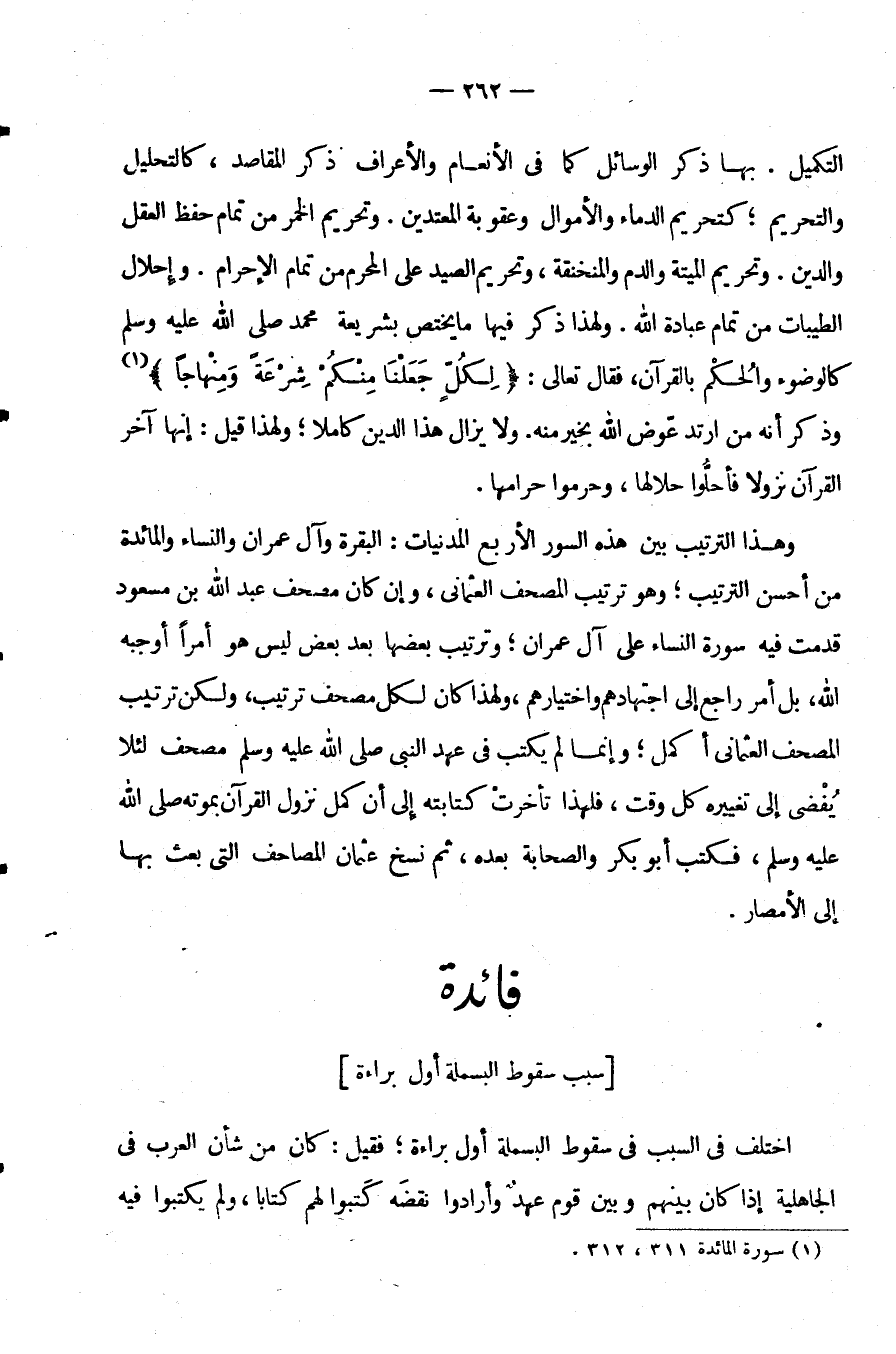 وَهَذَا التَّرْتِيبُ بَيْنَ هَذِهِ السُّوَرِ الأربع المدنيات: البقرة وآل عمران والنساء والمائدة مِنْ أَحْسَنِ التَّرْتِيبِ وَهُوَ تَرْتِيبُ الْمُصْحَفِ الْعُثْمَانِيِّ وَإِنْ كَانَ مُصْحَفُ عَبْدِ اللَّهِ بْنِ مَسْعُودٍ قُدِّمَتْ فِيهِ سُورَةُ النِّسَاءِ عَلَى آلِ عِمْرَانَ وَتَرْتِيبُ بَعْضِهَا بَعْدَ بَعْضٍ لَيْسَ هُوَ أَمْرًا أَوْجَبَهُ اللَّهُ بَلْ أَمْرٌ رَاجِعٌ إِلَى اجْتِهَادِهِمْ وَاخْتِيَارِهِمْ وَلِهَذَا كَانَ لِكُلِّ مُصْحَفٍ تَرْتِيبٌ وَلَكِنَّ تَرْتِيبَ الْمُصْحَفِ الْعُثْمَانِيِّ أَكْمَلُ وَإِنَّمَا لَمْ يُكْتَبْ فِي عَهْدِ النَّبِيِّ صَلَّى اللَّهُ عَلَيْهِ وَسَلَّمَ مُصْحَفٌ لِئَلَّا يُفْضِيَ إِلَى تَغْيِيرِهِ كُلَّ وَقْتٍ فَلِهَذَا تَأَخَّرَتْ كِتَابَتُهُ إِلَى أَنْ كَمُلَ نُزُولُ الْقُرْآنِ بِمَوْتِهِ صَلَّى اللَّهُ عَلَيْهِ وَسَلَّمَ فَكَتَبَ أَبُو بَكْرٍ وَالصَّحَابَةُ بَعْدَهُ ثُمَّ نَسَخَ عُثْمَانُ الْمَصَاحِفَ الَّتِي بَعَثَ بِهَا إِلَى الْأَمْصَارِ