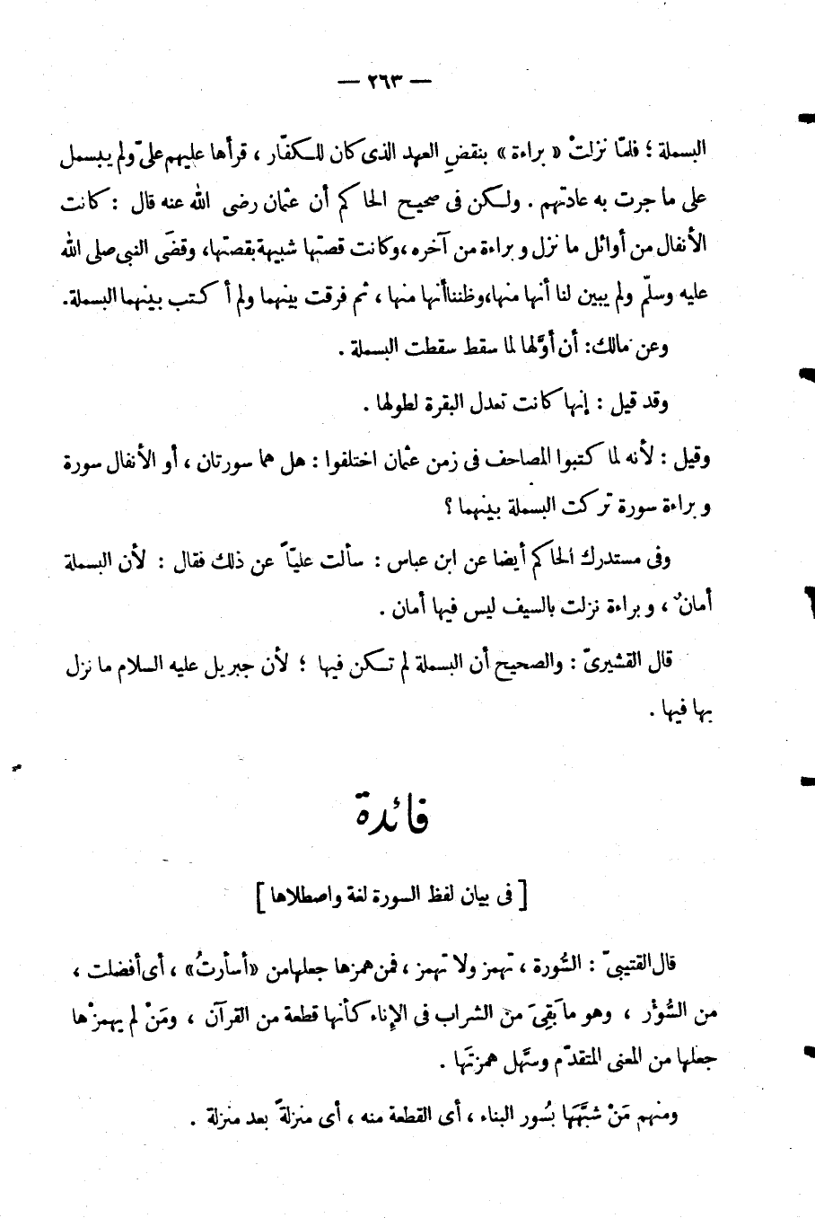 قَالَ الْقُشَيْرِيُّ وَالصَّحِيحُ أَنَّ الْبَسْمَلَةَ لَمْ تَكُنْ فِيهَا لِأَنَّ جِبْرِيلَ عَلَيْهِ السَّلَامُ مَا نَزَلَ بِهَا فِيهَا