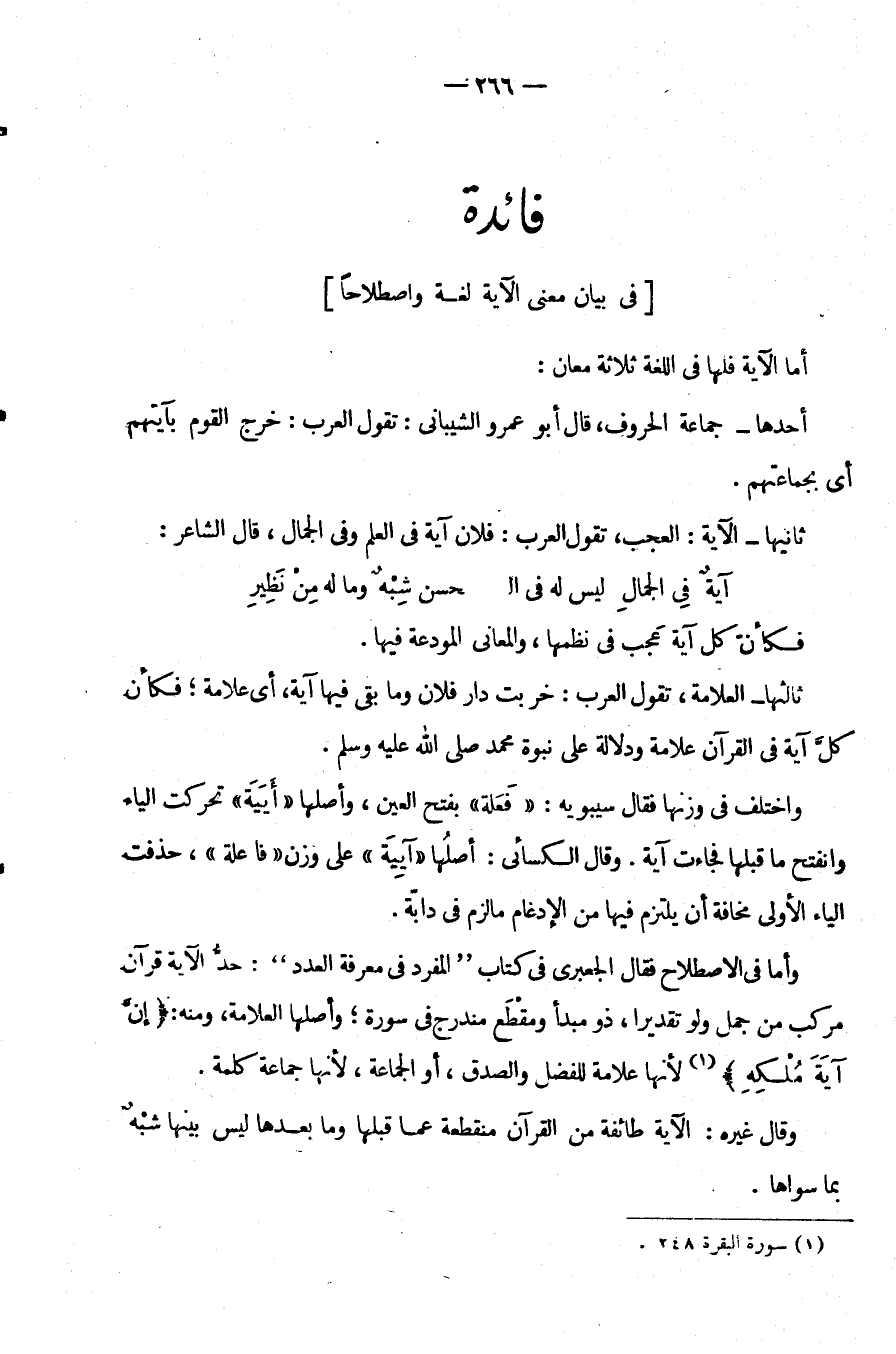 ثَالِثُهَا_الْعَلَامَةُ تَقُولُ الْعَرَبُ: خَرِبَتْ دَارُ فُلَانٍ وَمَا بَقِيَ فِيهَا آيَةٌ أَيْ عَلَامَةٌ فَكَأَنَّ كُلَّ آيَةٍ فِي الْقُرْآنِ عَلَامَةٌ وَدَلَالَةٌ عَلَى نُبُوَّةِ مُحَمَّدٍ صَلَّى اللَّهُ عَلَيْهِ وَسَلَّمَ