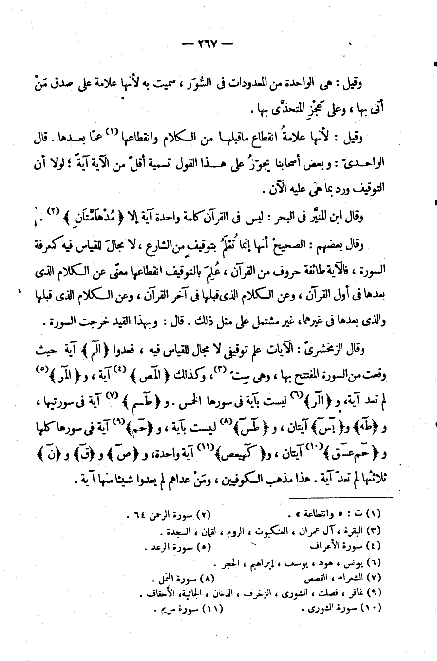 وَقَالَ الزَّمَخْشَرِيُّ: الْآيَاتُ عِلْمُ تَوْقِيفٍ لَا مَجَالَ لِلْقِيَاسِ فِيهِ فَعَدُّوا: {الم} آيَةً حَيْثُ وَقَعَتْ مِنَ السورة المفتتح بها وهي ست، وكذلك: {المص} آية، و {المر} لَمْ تُعَدَّ آيَةً وَ {الر} لَيْسَتْ بِآيَةٍ فِي سُوَرِهَا الْخَمْسِ وَ: {طسم} آيَةٌ فِي سورتيها، وَ: {طه} وَ: {يس} آيَتَانِ وَ {طس} لَيْسَتْ بِآيَةٍ وَ {حم} آيَةٌ فِي سُوَرِهَا كلها و {حم عسق} آيتان و: {كهيعص} آيَةٌ وَاحِدَةٌ وَ {ص} وَ {ق} وَ {ن} ثَلَاثَتُهَا لَمْ تَعُدَّ آيَةً هَذَا مَذْهَبُ الْكُوفِيِّينَ وَمَنْ عَدَاهُمْ لَمْ يَعُدُّوا شَيْئًا مِنْهَا آية