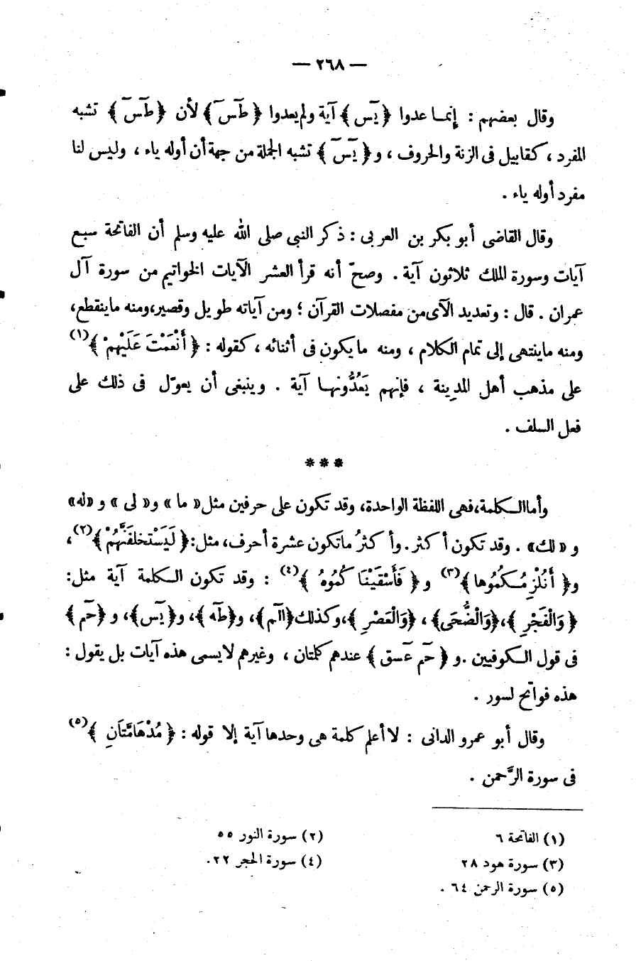 وَقَالَ أَبُو عَمْرٍو الدَّانِيُّ لَا أَعْلَمُ كَلِمَةً هِيَ وَحْدَهَا آيَةٌ إِلَّا قَوْلَهُ: {مُدْهَامَّتَانِ} فِي سُورَةِ الرحمن