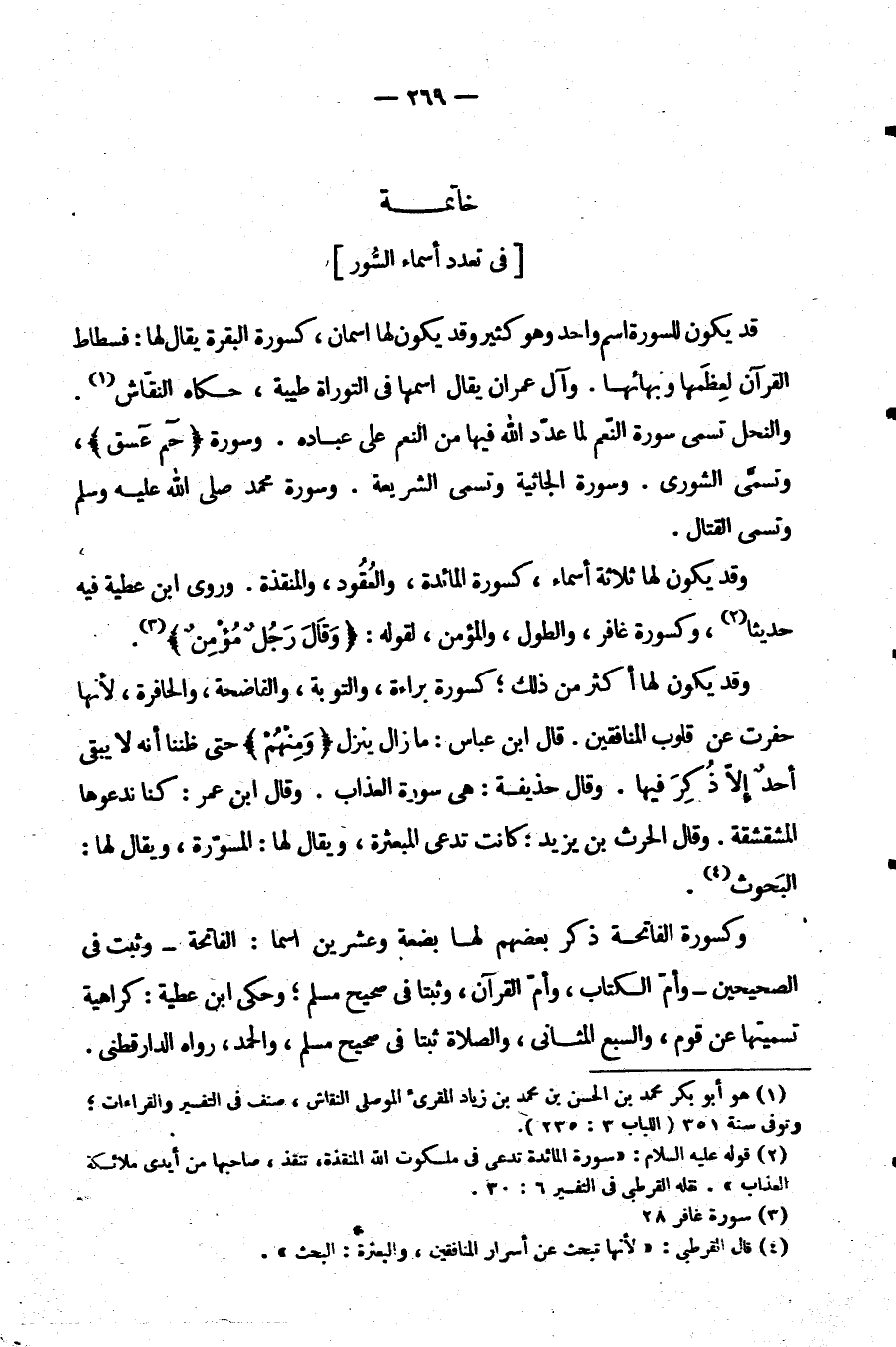 قد يكون للسورة اسم وَهُوَ كَثِيرٌ وَقَدْ يَكُونُ لَهَا اسْمَانِ كَسُورَةِ الْبَقَرَةِ يُقَالُ لَهَا فُسْطَاطُ الْقُرْآنِ لِعِظَمِهَا وَبَهَائِهَا وآل عِمْرَانَ يُقَالُ اسْمُهَا فِي التَّوْرَاةِ طَيِّبَةٌ حَكَاهُ النقش والنحل تُسَمَّى سُورَةَ النِّعَمَ لِمَا عَدَّدَ اللَّهُ فِيهَا مِنَ النِّعَمِ عَلَى عِبَادِهِ وَسُورَةِ: {حم عسق} وَتُسَمَّى الشُّورَى وَسُورَةِ الْجَاثِيَةِ وَتُسَمَّى الشَّرِيعَةَ وَسُورَةِ مُحَمَّدٍ صَلَّى اللَّهُ عَلَيْهِ وَسَلَّمَ وَتُسَمَّى الْقِتَالُ وَقَدْ يَكُونُ لَهَا ثَلَاثَةُ أَسْمَاءٍ كَسُورَةِ الْمَائِدَةِ وَالْعُقُودِ وَالْمُنْقِذَةِ وَرَوَى ابْنُ عَطِيَّةَ فِيهِ حَدِيثًا وَكَسُورَةِ غَافِرٍ وَالطَّوْلِ وَالْمُؤْمِنِ لِقَوْلِهِ: {وَقَالَ رَجُلٌ مؤمن} .