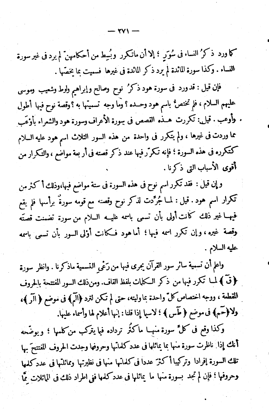وَإِنْ قِيلَ: فَقَدْ تَكَرَّرَ اسْمُ نُوحٍ فِي هَذِهِ السُّورَةِ فِي سِتَّةِ مَوَاضِعَ فِيهَا وَذَلِكَ أَكْثَرُ مِنْ تَكْرَارِ اسْمِ هُودٍ قِيلَ لَمَّا جُرِّدَتْ لِذِكْرِ نُوحٍ وَقِصَّتِهِ مَعَ قَوْمِهِ سُورَةٌ بِرَأْسِهَا فَلَمْ يَقَعْ فِيهَا غَيْرُ ذَلِكَ كَانَتْ أَوْلَى بِأَنْ تُسَمَّى بِاسْمِهِ عَلَيْهِ السَّلَامُ مِنْ سُورَةٍ تَضَمَّنَتْ قِصَّتَهُ وَقِصَّةَ غَيْرِهِ وَإِنْ تكرر اسمه فيها أما هُودٍ فَكَانَتْ أَوْلَى السُّوَرِ بِأَنْ تُسَمَّى بِاسْمِهِ عَلَيْهِ السَّلَامُ