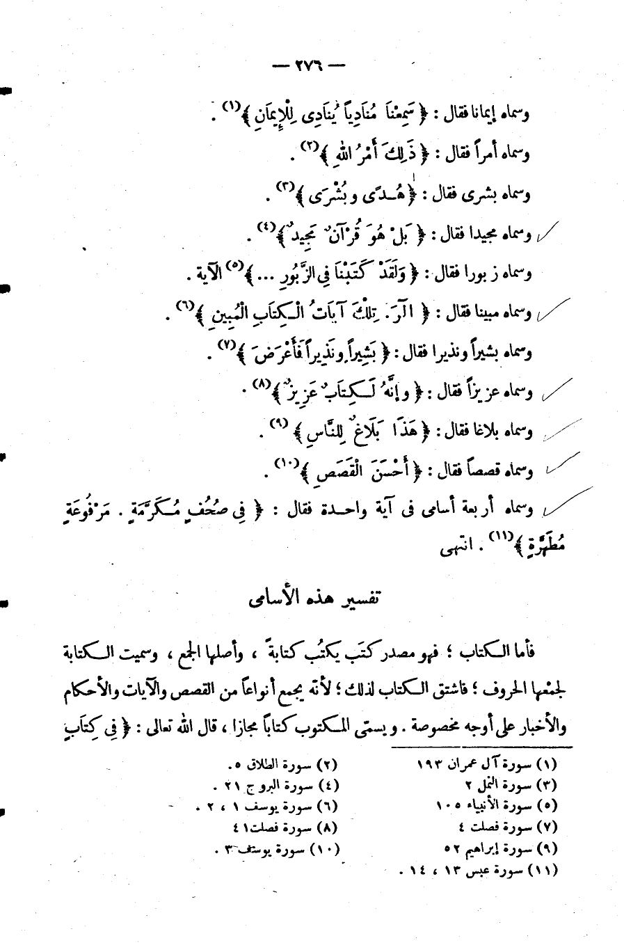 وَسَمَّاهُ أَرْبَعَةَ أَسَامِي فِي آيَةٍ وَاحِدَةٍ فَقَالَ: {في صحف مكرمة مرفوعة مطهرة} ، انْتَهَى