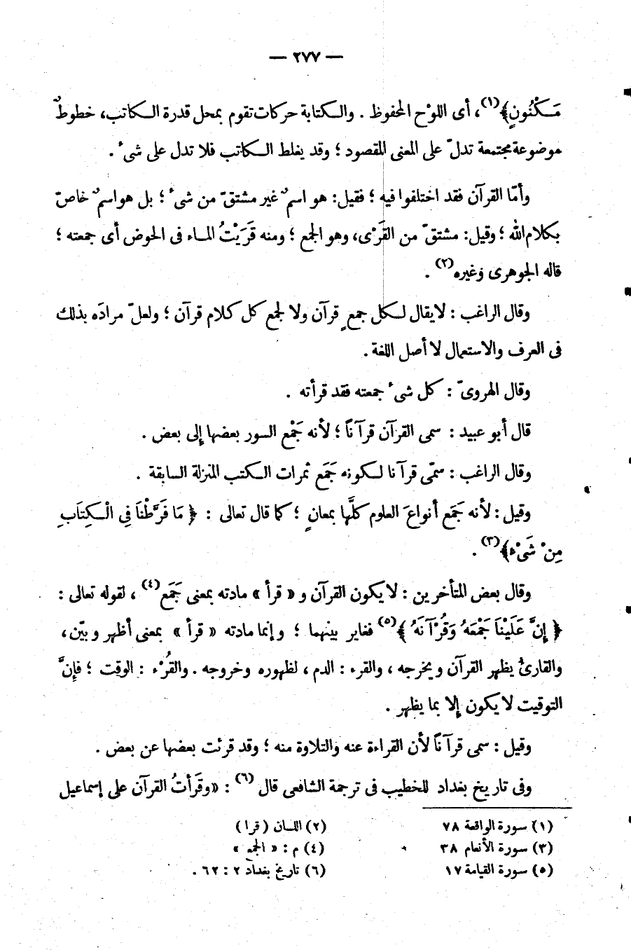 وَقَالَ الرَّاغِبُ لَا يُقَالُ لِكُلِّ جَمْعٍ قُرْآنٌ وَلَا لِجَمْعِ كَلِّ كَلَامٍ قُرْآنٌ وَلَعَلَّ مُرَادَهُ بِذَلِكَ فِي الْعُرْفِ وَالِاسْتِعْمَالِ لَا أَصْلِ اللُّغَةِ