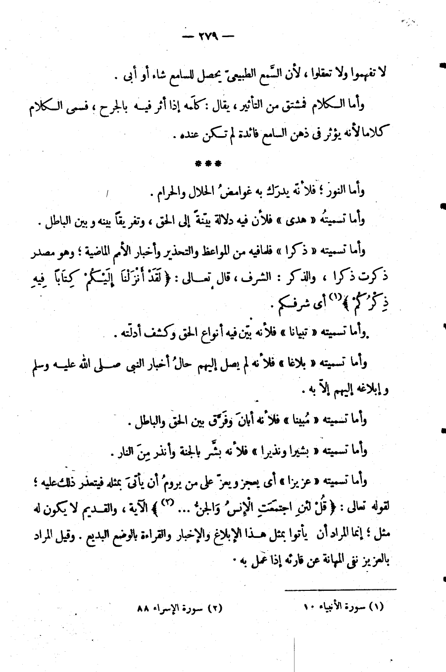وَأَمَّا تَسْمِيَتُهُ عَزِيزًا أَيْ يُعْجِزُ وَيَعِزُّ عَلَى مَنْ يَرُومُ أَنْ يَأْتِيَ بِمِثْلِهِ فَيَتَعَذَّرُ ذَلِكَ عَلَيْهِ لِقَوْلِهِ تَعَالَى: {قُلْ لئن اجتمعت الأنس والجن} الْآيَةَ
