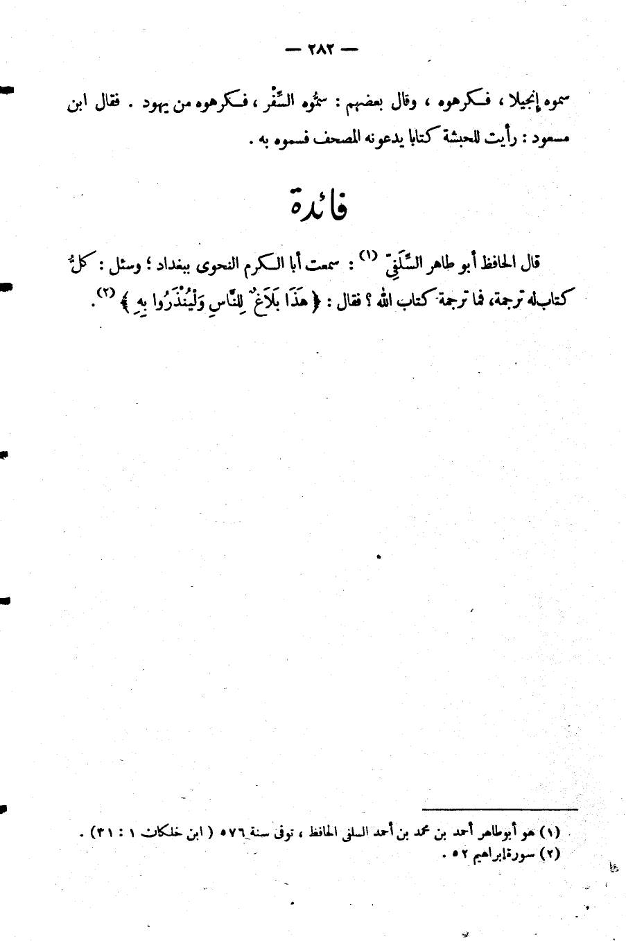 قَالَ الْحَافِظُ أَبُو طَاهِرٍ السِّلَفِيُّ سَمِعْتُ أَبَا الكرم النحوي بِبَغْدَادَ وَسُئِلَ كُلُّ كِتَابٍ لَهُ تَرْجَمَةٌ فَمَا تَرْجَمَةُ كِتَابِ اللَّهِ فَقَالَ: {هَذَا بَلَاغٌ لِلنَّاسِ ولينذروا به}