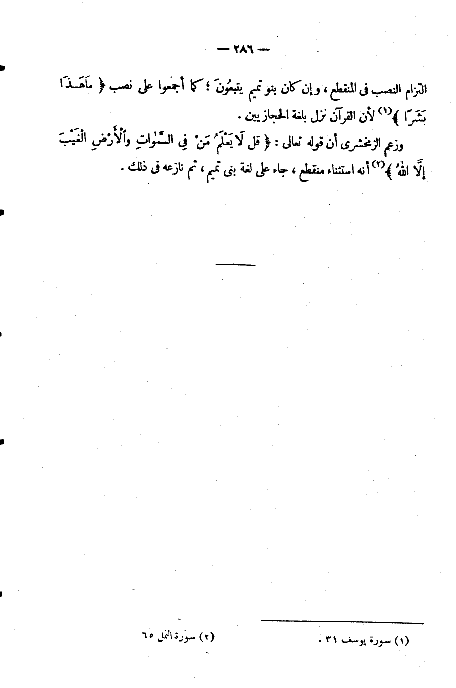 الْتِزَامُ النَّصْبِ فِي الْمُنْقَطِعِ وَإِنْ كَانَ بَنُو تَمِيمٍ يَتَّبِعُونَ كَمَا أَجْمَعُوا عَلَى نَصْبِ {مَا هذا بشرا} لِأَنَّ الْقُرْآنَ نَزَلَ بِلُغَةِ الْحِجَازِيِّينَ