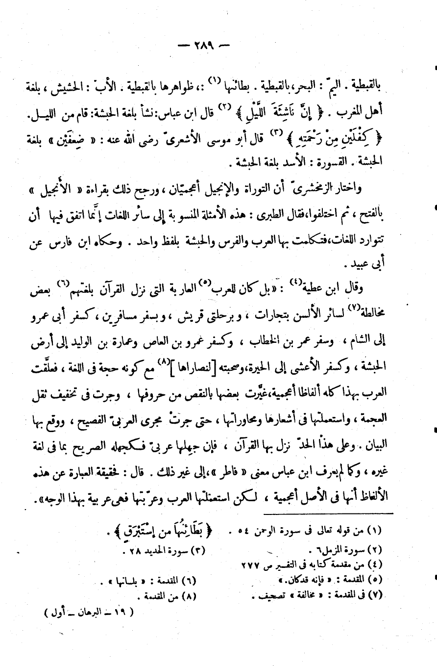 بالقبطية اليم البحر بالقبطية بطائنها ظواهرها بالقبطية الأب الْحَشِيشُ بِلُغَةِ أَهْلِ الْمَغْرِبِ: {إِنَّ نَاشِئَةَ اللَّيْلِ} قَالَ ابْنُ عَبَّاسٍ نَشَأَ بِلُغَةِ الْحَبَشَةِ قَامَ من الليل: {كفلين من رحمته} قَالَ أَبُو مُوسَى الْأَشْعَرِيُّ رَضِيَ اللَّهُ عَنْهُ ضعفين بلغة الحبشة القسورة الْأَسَدُ بِلُغَةِ الْحَبَشَةِ
