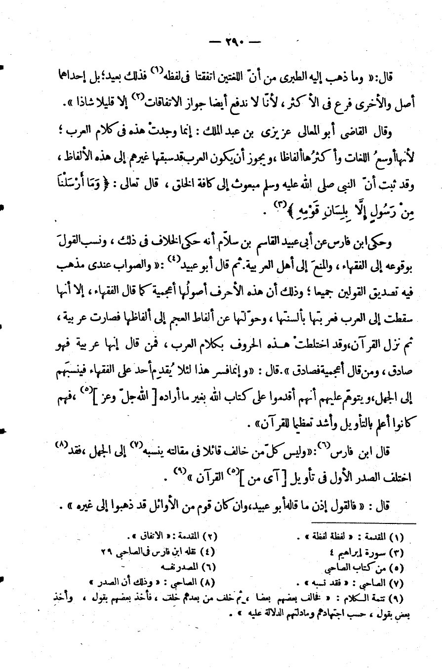 وَقَالَ الْقَاضِي أَبُو الْمَعَالِي عَزِيزِيُّ بْنُ عَبْدِ الْمَلِكِ إِنَّمَا وُجِدَتْ هَذِهِ فِي كَلَامِ الْعَرَبِ لِأَنَّهَا أَوْسَعُ اللُّغَاتِ وَأَكْثَرُهَا أَلْفَاظًا وَيَجُوزُ أَنْ يَكُونَ الْعَرَبُ قَدْ سَبَقَهَا غَيْرُهُمْ إِلَى هَذِهِ الْأَلْفَاظِ وَقَدْ ثَبَتَ أَنَّ النَّبِيَّ صَلَّى اللَّهُ عَلَيْهِ وَسَلَّمَ مَبْعُوثٌ إِلَى كَافَّةِ الْخَلْقِ قَالَ تَعَالَى: {وَمَا أَرْسَلْنَا مِنْ رَسُولٍ إِلَّا بلسان قومه} وَحَكَى ابْنُ فَارِسٍ عَنْ أَبِي عُبَيْدٍ الْقَاسِمِ بْنِ سَلَّامٍ أَنَّهُ حَكَى الْخِلَافَ فِي ذَلِكَ وَنَسَبَ الْقَوْلَ بِوُقُوعِهِ إِلَى الْفُقَهَاءِ وَالْمَنْعَ إِلَى أَهْلِ الْعَرَبِيَّةِ ثُمَّ قَالَ أَبُو عُبَيْدٍ وَالصَّوَابُ عِنْدِي مَذْهَبٌ فِيهِ تَصْدِيقُ الْقَوْلَيْنِ جَمِيعًا وَذَلِكَ أَنَّ هَذِهِ الْأَحْرُفَ أُصُولُهَا أَعْجَمِيَّةٌ كَمَا قَالَ الْفُقَهَاءُ إِلَّا أَنَّهَا سَقَطَتْ إِلَى الْعَرَبِ فَعَرَّبَتْهَا بِأَلْسِنَتِهَا وَحَوَّلَتْهَا عَنْ أَلْفَاظِ الْعَجَمِ إِلَى أَلْفَاظِهَا فَصَارَتْ عَرَبِيَّةً ثُمَّ نَزَلَ الْقُرْآنُ وَقَدِ اخْتَلَطَتْ هَذِهِ الْحُرُوفُ بِكَلَامِ الْعَرَبِ فَمَنْ قَالَ إِنَّهَا عَرَبِيَّةٌ فَهُوَ صَادِقٌ وَمَنْ قَالَ أَعْجَمِيَّةٌ فَصَادِقٌ قال وإنما فسر هَذَا لِئَلَّا يُقْدِمَ أَحَدٌ عَلَى الْفُقَهَاءِ فَيَنْسِبَهُمْ إِلَى الْجَهْلِ وَيَتَوَهَّمَ عَلَيْهِمْ أَنَّهُمْ أَقْدَمُوا عَلَى كتاب الله بغير ما أراده الله جل وعز فَهُمْ كَانُوا أَعْلَمَ بِالتَّأْوِيلِ وَأَشَدَّ تَعْظِيمًا لِلْقُرْآنِ