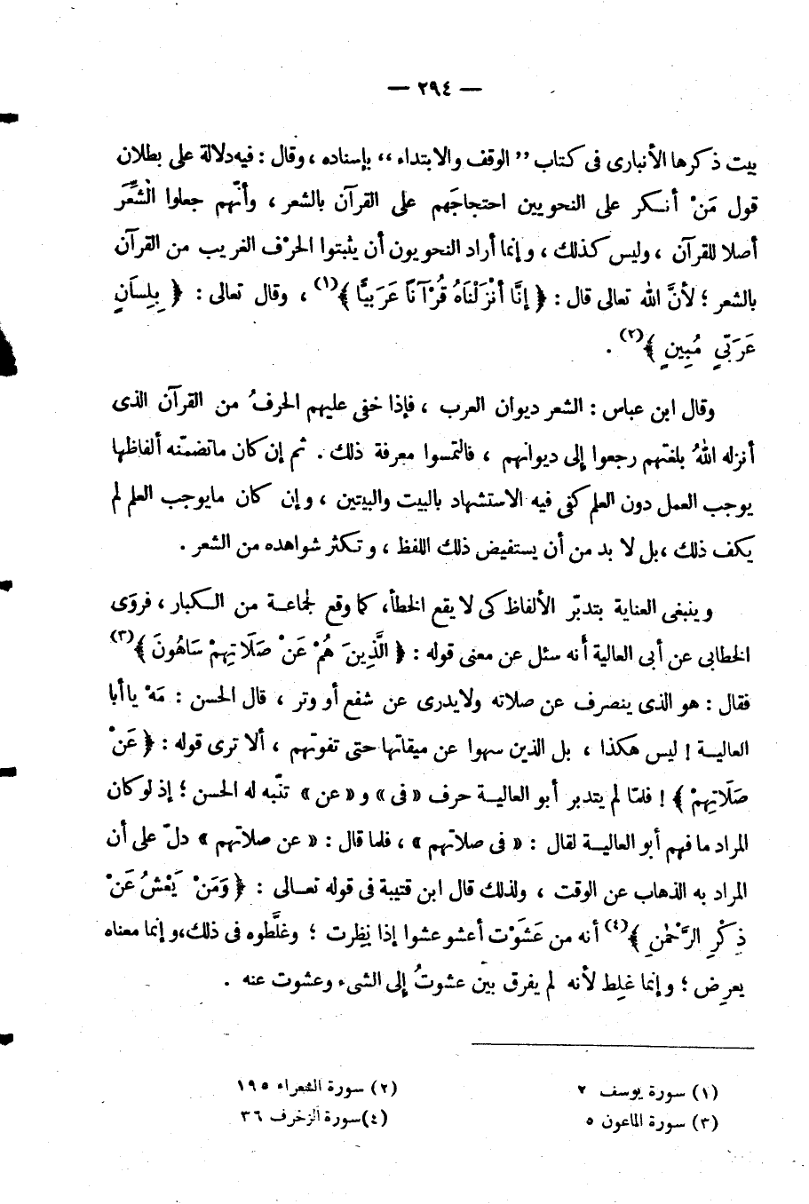 وَيَنْبَغِي الْعِنَايَةُ بِتَدَبُّرِ الْأَلْفَاظِ كَيْ لَا يَقَعَ الْخَطَأُ كَمَا وَقَعَ لِجَمَاعَةٍ مِنَ الْكِبَارِ فَرَوَى الْخَطَّابِيُّ عَنْ أَبِي الْعَالِيَةِ أَنَّهُ سُئِلَ عَنْ مَعْنَى قَوْلِهِ: {الَّذِينَ هُمْ عَنْ صَلَاتِهِمْ ساهون} فَقَالَ هُوَ الَّذِي يَنْصَرِفُ عَنْ صِلَاتِهِ وَلَا يَدْرِي عَنْ شَفْعٍ أَوْ وَتْرٍ قَالَ الْحَسَنُ مَهْ يَا أَبَا الْعَالِيَةِ لَيْسَ هَكَذَا بَلِ الَّذِينَ سَهَوْا عَنْ مِيقَاتِهِمْ حَتَّى تَفُوتَهُمْ أَلَا تَرَى قَوْلَهُ: {عَنْ صَلَاتِهِمْ} فَلَمَّا لَمْ يَتَدَبَّرْ أبو العالية حرف في وعن تَنَبَّهَ لَهُ الْحَسَنُ إِذْ لَوْ كَانَ الْمُرَادُ مَا فَهِمَ أَبُو الْعَالِيَةِ لَقَالَ فِي صَلَاتِهِمْ فَلَمَّا قَالَ عَنْ صَلَاتِهِمْ دَلَّ عَلَى أَنَّ الْمُرَادَ بِهِ الذَّهَابُ عَنِ الْوَقْتِ وَلِذَلِكَ قَالَ ابْنُ قُتَيْبَةَ فِي قَوْلِهِ تَعَالَى: {وَمَنْ يَعْشُ عن ذكر الرحمن} أَنَّهُ مِنْ عَشَوْتُ أَعْشُو عَشْوًا إِذَا نَظَرْتُ وَغَلَّطُوهُ فِي ذَلِكَ وَإِنَّمَا مَعْنَاهُ يُعْرِضْ وَإِنَّمَا غَلِطَ لِأَنَّهُ لَمْ يُفَرِّقْ بَيْنَ عَشَوْتُ إِلَى الشَّيْءِ وَعَشَوْتُ عَنْهُ