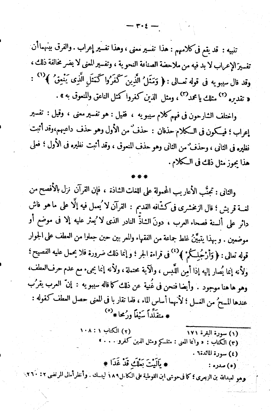 وَالثَّانِي: تَجَنُّبُ الْأَعَارِيبِ الْمَحْمُولَةِ عَلَى اللُّغَاتِ الشَّاذَّةِ فَإِنَّ الْقُرْآنَ نَزَلَ بِالْأَفْصَحِ مِنْ لُغَةِ قُرَيْشٍ قَالَ الزَّمَخْشَرِيُّ فِي كَشَّافِهِ الْقَدِيمِ الْقُرْآنُ لَا يُعْمَلُ فِيهِ إِلَّا عَلَى مَا هُوَ فَاشٍ دَائِرٌ عَلَى أَلْسِنَةِ فُصَحَاءِ الْعَرَبِ دُونَ الشَّاذِّ النَّادِرِ الَّذِي لَا يُعْثَرُ عَلَيْهِ إِلَّا فِي مَوْضِعٍ أَوْ مَوْضِعَيْنِ وَبِهَذَا يَتَبَيَّنُ غَلَطُ جَمَاعَةٍ مِنَ الْفُقَهَاءِ وَالْمُعْرِبِينَ حِينَ جَعَلُوا مِنَ الْعَطْفِ عَلَى الْجِوَارِ قوله تعالى: {وأرجلكم} فِي قِرَاءَةِ الْجَرِّ وَإِنَّمَا ذَلِكَ ضَرُورَةٌ فَلَا يُحْمَلُ عَلَيْهِ الْفَصِيحُ وَلِأَنَّهُ إِنَّمَا يُصَارُ إِلَيْهِ إِذَا أُمِنَ اللَّبْسُ وَالْآيَةُ مُحْتَمِلَةٌ وَلِأَنَّهُ إِنَّمَا يَجِيءُ مَعَ عَدَمِ حَرْفِ الْعَطْفِ وَهُوَ هَاهُنَا مَوْجُودٌ وَأَيْضًا فَنَحْنُ فِي غِنْيَةٍ عَنْ ذَلِكَ كَمَا قَالَهُ سِيبَوَيْهِ إِنَّ الْعَرَبَ يَقْرُبُ عِنْدَهَا الْمَسْحُ مَعَ الْغُسْلِ لِأَنَّهُمَا أَسَاسُ الْمَاءِ فَلَمَّا تَقَارَبَا فِي الْمَعْنَى حَصَلَ الْعَطْفُ كَقَوْلِهِ: