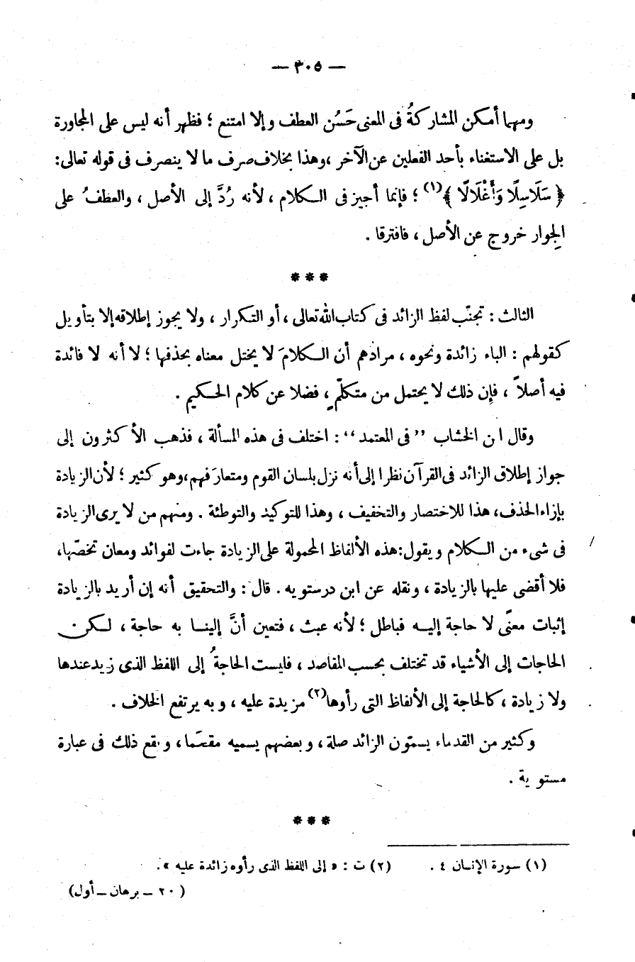 الثَّالِثُ: تَجَنُّبُ لَفْظِ الزَّائِدِ فِي كِتَابِ اللَّهِ تَعَالَى أَوِ التَّكْرَارِ وَلَا يَجُوزُ إِطْلَاقُهُ إِلَّا بِتَأْوِيلٍ كَقَوْلِهِمْ الْبَاءُ زَائِدَةٌ وَنَحْوِهِ مُرَادُهُمْ أَنَّ الْكَلَامَ لَا يَخْتَلُّ مَعْنَاهُ بِحَذْفِهَا لَا أَنَّهُ لَا فَائِدَةَ فِيهِ أَصْلًا فَإِنَّ ذَلِكَ لَا يُحْتَمَلُ مِنْ مُتَكَلِّمٍ فَضْلًا عَنْ كَلَامِ الْحَكِيمِ