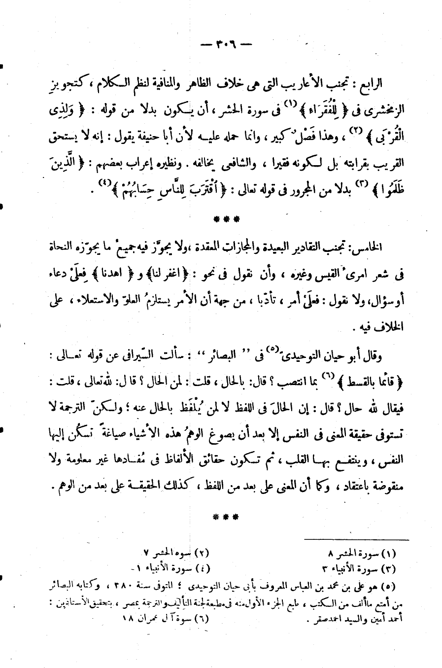 الرَّابِعُ: تُجَنُّبُ الْأَعَارِيبِ الَّتِي هِيَ خِلَافُ الظَّاهِرِ وَالْمُنَافِيَةُ لِنَظْمِ الْكَلَامِ كَتَجْوِيزِ الزَّمَخْشَرِيِّ فِي {لِلْفُقَرَاءِ} في سورة الحشر أَنْ يَكُونَ بَدَلًا مِنْ قَوْلِهِ: {وَلِذِي الْقُرْبَى} وَهَذَا فَصْلٌ كَبِيرٌ وَإِنَّمَا حَمَلَهُ عَلَيْهِ لِأَنَّ أَبَا حَنِيفَةَ يَقُولُ إِنَّهُ لَا يَسْتَحِقُّ الْقَرِيبُ بِقَرَابَتِهِ بَلْ لِكَوْنِهِ فَقِيرًا وَالشَّافِعِيُّ يُخَالِفُهُ وَنَظِيرُهُ إعراب بعضهم {الذين ظلموا. . . . .} بَدَلًا مِنَ الْمَجْرُورِ فِي قَوْلِهِ تَعَالَى: {اقْتَرَبَ للناس حسابهم}