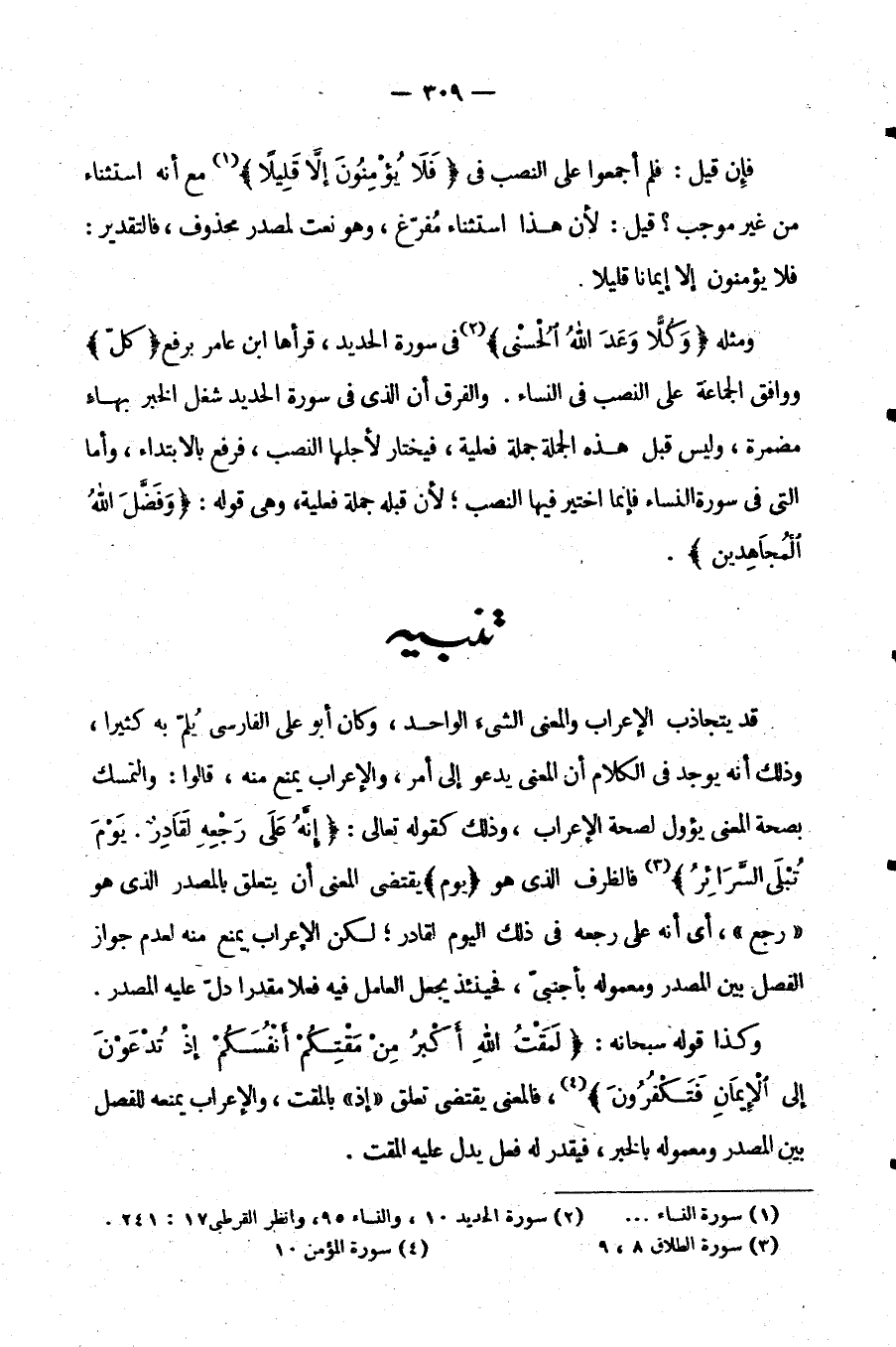 وَمِثْلُهُ: {وَكُلًّا وَعَدَ اللَّهُ الْحُسْنَى} فِي سُورَةِ الحديد قَرَأَهَا ابْنُ عَامِرٍ بِرَفْعِ: {كَلٍّ} وَوَافَقَ الْجَمَاعَةَ على النصب في النساء وَالْفَرْقُ أَنَّ الَّذِي فِي سُورَةِ الْحَدِيدِ شُغِلَ الْخَبَرُ بِهَاءٍ مُضْمَرَةٍ وَلَيْسَ قَبْلَ هَذِهِ الْجُمْلَةِ جُمْلَةٌ فِعْلِيَّةٌ فَيُخْتَارُ لِأَجْلِهَا النَّصْبُ فَرُفِعَ بِالِابْتِدَاءِ وَأَمَّا الَّتِي فِي سُورَةِ النِّسَاءِ فَإِنَّمَا اخْتِيرَ فِيهَا النَّصْبُ لِأَنَّ قَبْلَهُ جُمْلَةٌ فِعْلِيَّةٌ وَهِيَ قوله: {وَفَضَّلَ اللَّهُ الْمُجَاهِدِينَ}