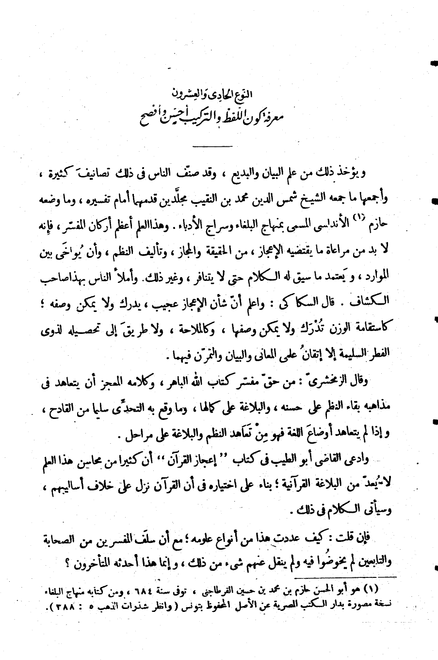 وَيُؤْخَذُ ذَلِكَ مِنْ عِلْمِ الْبَيَانِ وَالْبَدِيعِ وَقَدْ صَنَّفَ النَّاسُ فِي ذَلِكَ تَصَانِيفَ كَثِيرَةً وَأَجْمَعُهَا مَا جَمَعَهُ الشَّيْخُ شَمْسُ الدِّينِ مُحَمَّدُ بْنُ النَّقِيبِ مُجَلَّدَيْنِ قَدَّمَهُمَا أَمَامَ تَفْسِيرِهِ وَمَا وَضَعَهُ حَازِمٌ الأندلسي المسمى بمنهاج الْبُلَغَاءِ وَسِرَاجِ الْأُدَبَاءِ وَهَذَا الْعِلْمُ أَعْظَمُ أَرْكَانِ الْمُفَسِّرِ فَإِنَّهُ لَا بُدَّ مِنْ مُرَاعَاةِ مَا يَقْتَضِيهِ الْإِعْجَازُ مِنَ الْحَقِيقَةِ وَالْمَجَازِ وَتَأْلِيفِ النَّظْمِ وَأَنْ يُوَاخِي بَيْنَ الْمَوَارِدِ وَيَعْتَمِدَ مَا سِيقَ لَهُ الْكَلَامُ حَتَّى لَا يَتَنَافَرَ وَغَيْرُ ذَلِكَ وَأَمْلَأُ النَّاسِ بِهَذَا صَاحِبُ الْكَشَّافِ قَالَ السَّكَّاكِيُّ وَاعْلَمْ أَنَّ شَأْنَ الْإِعْجَازِ عَجِيبٌ يُدْرَكُ وَلَا يُمْكِنُ وَصْفُهُ كَاسْتِقَامَةِ الْوَزْنِ تُدْرَكُ وَلَا يُمْكِنُ وَصْفُهَا وَكَالْمَلَاحَةِ وَلَا طَرِيقَ إِلَى تَحْصِيلِهِ لِذَوِي الْفِطَرِ السَّلِيمَةِ إِلَّا إِتْقَانُ عِلْمَيِ الْمَعَانِي وَالْبَيَانِ وَالتَّمَرُّنُ فِيهِمَا