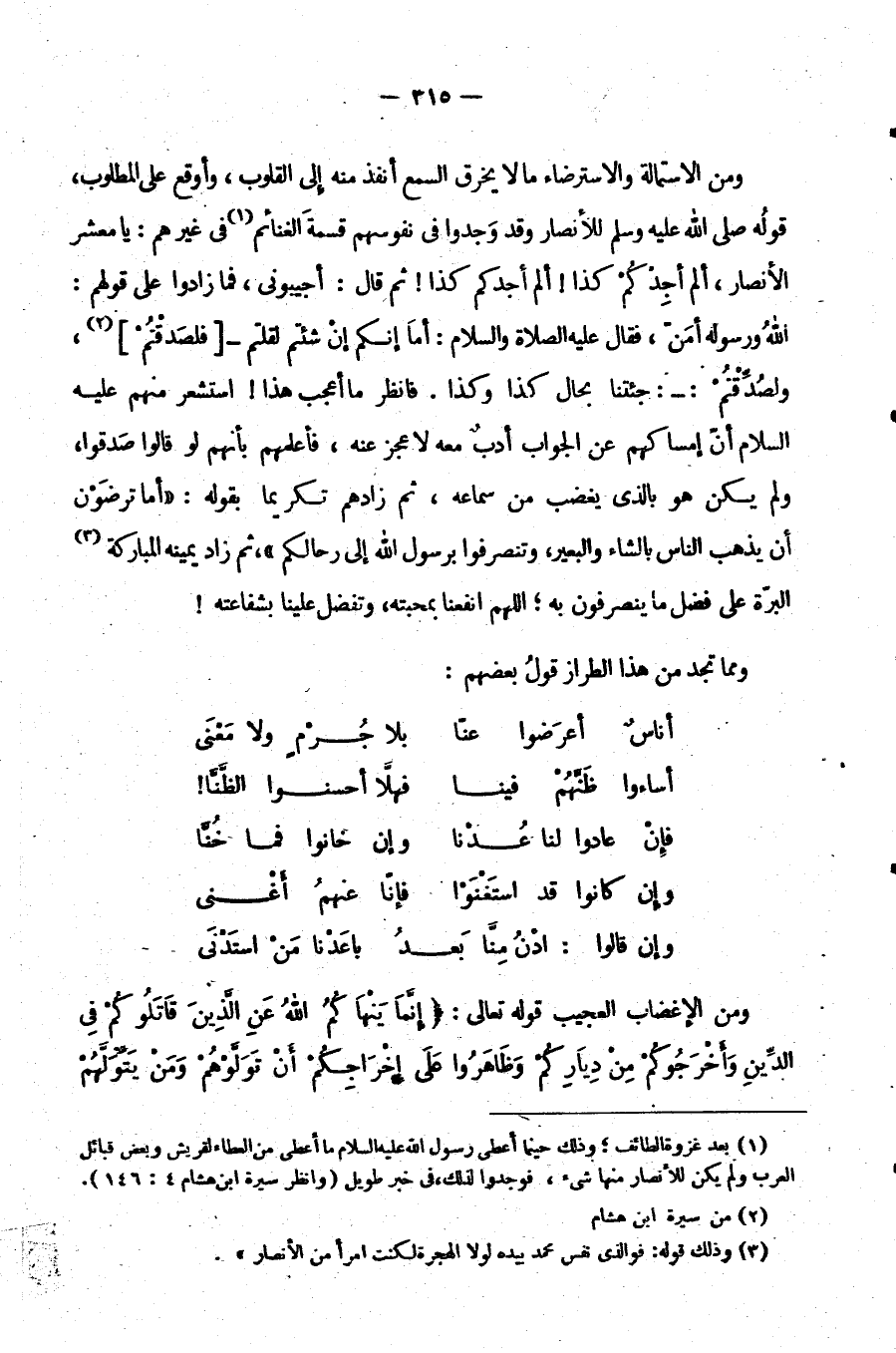 وَمِنَ الِاسْتِمَالَةِ وَالِاسْتِرْضَاءِ مَا لَا يَخْرِقُ السَّمْعَ أَنْفَذُ مِنْهُ إِلَى الْقُلُوبِ وَأَوْقَعُ عَلَى الْمَطْلُوبِ قَوْلُهُ صَلَّى اللَّهُ عَلَيْهِ وَسَلَّمَ لِلْأَنْصَارِ وَقَدْ وَجَدُوا فِي نُفُوسِهِمْ قِسْمَةَ الْغَنَائِمِ فِي غَيْرِهِمْ: "يَا مَعْشَرَ الْأَنْصَارِ أَلَمْ أَجِدْكُمْ كَذَا أَلَمْ أَجِدْكُمْ كَذَا ثُمَّ قَالَ أَجِيبُونِي فَمَا زَادُوا عَلَى قَوْلِهِمْ اللَّهُ وَرَسُولُهُ أَمَنُّ فَقَالَ عَلَيْهِ الصَّلَاةُ وَالسَّلَامُ أَمَا إِنَّكُمْ إِنْ شِئْتُمْ لَقُلْتُمْ فلصدقتم وَلَصَدَقْتُمْ جِئْتَنَا بِحَالِ كَذَا وَكَذَا" فَانْظُرْ مَا أَعْجَبَ هَذَا اسْتَشْعَرَ مِنْهُمْ عَلَيْهِ السَّلَامُ أَنَّ إِمْسَاكَهُمْ عَنِ الْجَوَابِ أَدَبٌ مَعَهُ لَا عَجْزٌ عَنْهُ فَأَعْلَمَهُمْ بِأَنَّهُمْ لَوْ قَالُوا صُدِّقُوا وَلَمْ يَكُنْ هُوَ بِالَّذِي يَغْضَبُ مِنْ سَمَاعِهِ ثُمَّ زَادَهُمْ تَكْرِيمًا بِقَوْلِهِ: "أَمَا تَرْضَوْنَ أَنْ يَذْهَبَ الناس بالشاة وَالْبَعِيرِ وَتَنْصَرِفُوا بِرَسُولِ اللَّهِ إِلَى رِحَالِكُمْ" ثُمَّ زَادَ يَمِينَهُ الْمُبَارَكَةَ الْبَرَّةَ عَلَى فَضْلِ مَا يَنْصَرِفُونَ بِهِ اللَّهُمَّ انْفَعْنَا بِمَحَبَّتِهِ وَتَفَضَّلْ عَلَيْنَا بِشَفَاعَتِهِ