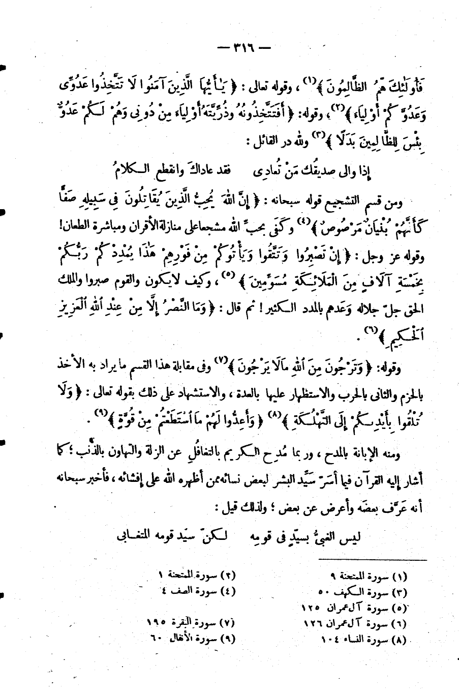 وَمِنْ قِسْمِ التَّشْجِيعِ قَوْلُهُ سُبْحَانَهُ: {إِنَّ اللَّهَ يُحِبُّ الَّذِينَ يُقَاتِلُونَ فِي سَبِيلِهِ صَفًّا كَأَنَّهُمْ بُنْيَانٌ مَرْصُوصٌ} وَكَفَى بِحُبِّ اللَّهِ مُشَجِّعًا عَلَى مُنَازَلَةِ الْأَقْرَانِ وَمُبَاشَرَةِ الطِّعَانِ وَقَوْلُهُ عَزَّ وَجَلَّ: {إِنْ تَصْبِرُوا وَتَتَّقُوا وَيَأْتُوكُمْ مِنْ فَوْرِهِمْ هَذَا يُمْدِدْكُمْ رَبُّكُمْ بخمسة آلاف من الملائكة مسومين} ، وَكَيْفَ لَا يَكُونُ وَالْقَوْمُ صَبَرُوا وَالْمَلِكُ الْحَقُّ جَلَّ جَلَالُهُ وَعَدَهُمْ بِالْمَدَدِ الْكَثِيرِ ثُمَّ قَالَ: {وَمَا النَّصْرُ إِلَّا مِنْ عِنْدِ اللَّهِ الْعَزِيزِ الحكيم}