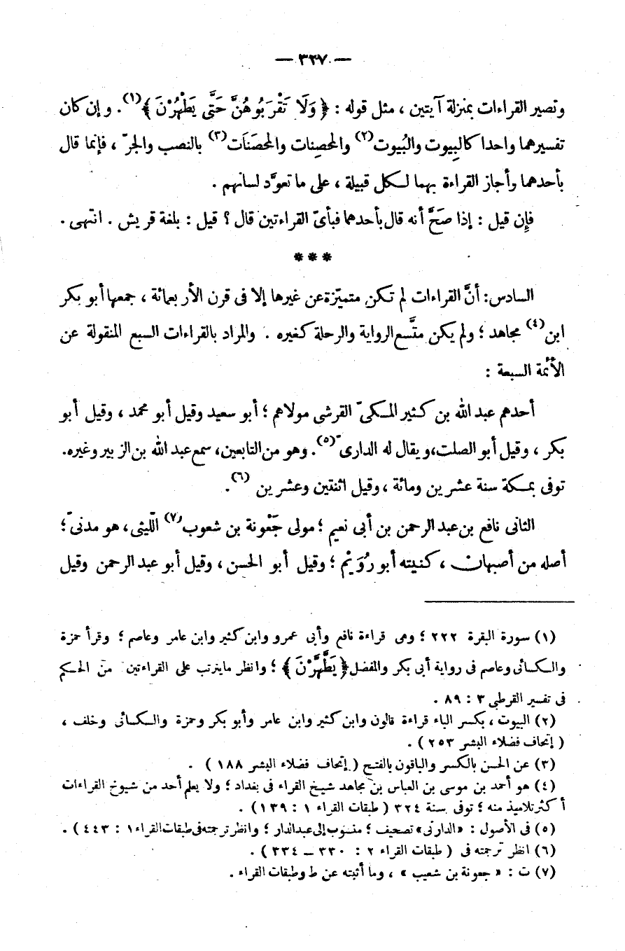 السَّادِسُ: أَنَّ الْقِرَاءَاتِ لَمْ تَكُنْ مُتَمَيِّزَةً عَنْ غَيْرِهَا إِلَّا فِي قَرْنِ الْأَرْبَعِمِائَةِ جَمَعَهَا أبو بكر ابن مُجَاهِدٍ وَلَمْ يَكُنْ مُتَّسِعُ الرِّوَايَةِ وَالرِّحْلَةِ كَغَيْرِهِ وَالْمُرَادُ بِالْقِرَاءَاتِ السَّبْعِ الْمَنْقُولَةُ عَنِ الْأَئِمَّةِ السَّبْعَةِ: