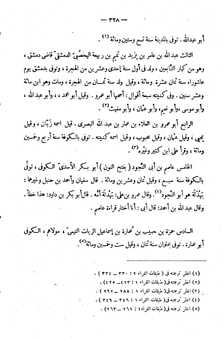 الْخَامِسُ: عَاصِمُ بْنُ أَبِي النَّجُودِ بِفَتْحِ النُّونِ أَبُو بَكْرٍ الْأَسَدِيُّ الْكُوفِيُّ تُوُفِّيَ بِالْكُوفَةِ سَنَةَ سَبْعٍ وَقِيلَ ثَمَانٍ وَعِشْرِينَ وَمِائَةٍ قَالَ سُفْيَانُ وَأَحْمَدُ بْنُ حَنْبَلٍ وَغَيْرُهُمَا بَهْدَلَةُ هُوَ أَبُو النَّجُودِ وَقَالَ عَمْرُو بْنُ عَلِيٍّ بَهْدَلَةُ أُمُّهُ قَالَ أَبُو بَكْرِ دَاوُدَ هَذَا خَطَأٌ