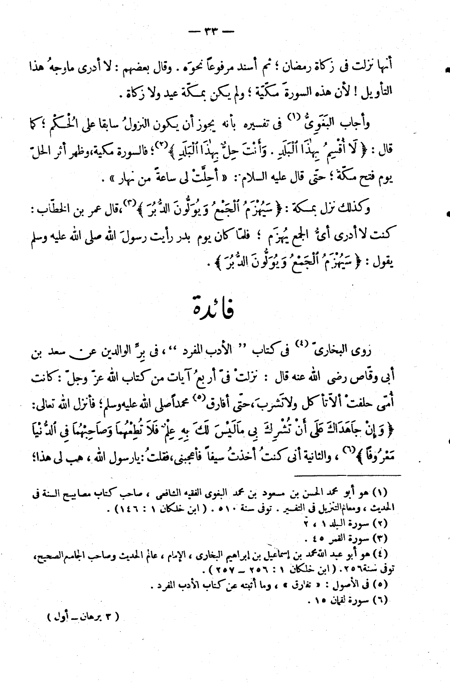 وَأَجَابَ البغوي في تفسيره انه يَجُوزُ أَنْ يَكُونَ النُّزُولُ سَابِقًا عَلَى الْحُكْمِ كَمَا قَالَ {لَا أُقْسِمُ بِهَذَا الْبَلَدِ وَأَنْتَ حل بهذا الْبَلَدِ} فَالسُّورَةُ مَكِّيَّةٌ وَظُهُورُ أَثَرِ الْحِلِّ يَوْمَ فَتْحِ مَكَّةَ حَتَّى: قَالَ عَلَيْهِ السَّلَامُ: "أُحِلَّتْ لِي سَاعَةٌ مِنْ نَهَارٍ" وَكَذَلِكَ نَزَلَ بِمَكَّةَ {سيهزم الجمع ويولون الدبر} قَالَ عُمَرُ بْنُ الْخَطَّابِ: كُنْتُ لَا أَدْرِي: أَيَّ الْجَمْعِ يُهْزَمُ فَلَمَّا كَانَ يَوْمُ بَدْرٍ رَأَيْتُ رَسُولَ اللَّهِ صَلَّى اللَّهُ عَلَيْهِ وَسَلَّمَ يقول: " {سيهزم الجمع ويولون الدبر}