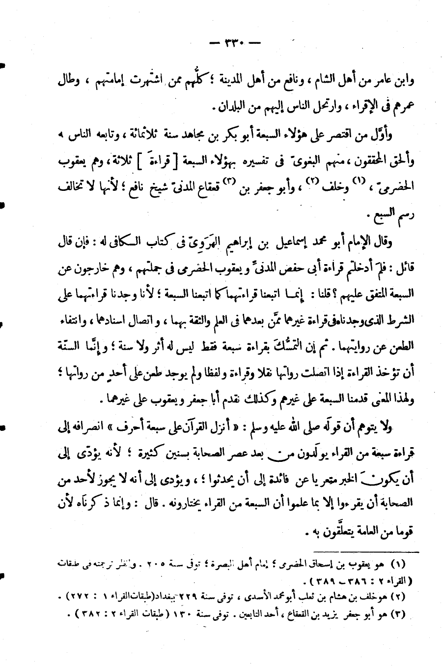وَأَوَّلُ مَنِ اقْتَصَرَ عَلَى هَؤُلَاءِ السَّبْعَةِ أَبُو بَكْرِ بْنُ مُجَاهِدٍ سَنَةَ ثَلَاثِمِائَةٍ وَتَابَعَهُ النَّاسُ وَأَلْحَقُ الْمُحَقِّقُونَ مِنْهُمُ الْبَغَوِيُّ فِي تَفْسِيرِهِ بِهَؤُلَاءِ السَّبْعَةِ قِرَاءَةَ ثَلَاثَةٍ وَهُمْ يَعْقُوبُ الْحَضْرَمِيُّ وَخَلَفٌ وَأَبُو جَعْفَرِ بْنُ قَعْقَاعٍ الْمَدَنِيُّ شَيْخُ نَافِعٍ لِأَنَّهَا لَا تُخَالِفُ رَسْمَ السَّبْعِ