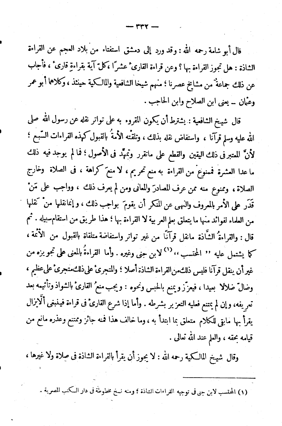 قَالَ أَبُو شَامَةَ رَحِمَهُ اللَّهُ وَقَدْ وَرَدَ إِلَى دِمَشْقَ اسْتِفْتَاءٌ مِنْ بِلَادِ الْعَجَمِ عَنِ الْقِرَاءَةِ الشَّاذَّةِ هَلْ تَجُوزُ الْقِرَاءَةُ بِهَا؟ وَعَنْ قِرَاءَةِ الْقَارِئِ عَشْرًا كُلُّ آيَةٍ بِقِرَاءَةِ قَارِئٍ فَأَجَابَ عَنْ ذَلِكَ جَمَاعَةٌ مِنْ مَشَايِخِ عَصْرِنَا منهم شيخنا الشافعية والمالكية حينئذ وكلاهما أبو عمر وَعُثْمَانُ يَعْنِي ابْنَ الصَّلَاحِ وَابْنَ الْحَاجِبِ