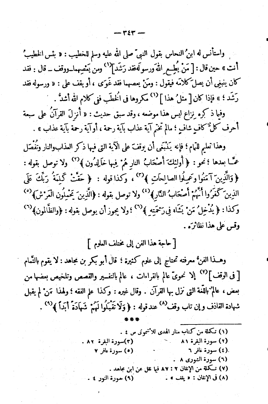 واستأنس له ابن النحاس بقول صَلَّى اللَّهُ عَلَيْهِ وَسَلَّمَ لِلْخَطِيبِ: "بِئْسَ الْخَطِيبُ أنت" حين قال: من يطع الله ورسوله فقد رشد ومن يعصمها وَوَقَفَ قَالَ قَدْ كَانَ يَنْبَغِي أَنْ يَصِلَ كلامه فيقول ومن يعصمها فَقَدْ غَوَى أَوْ يَقِفَ عَلَى وَرَسُولِهِ فَقَدْ رشد فإذا كان مثل هذا مَكْرُوهًا فِي الْخُطَبِ فَفِي كَلَامِ اللَّهِ أَشَدُّ