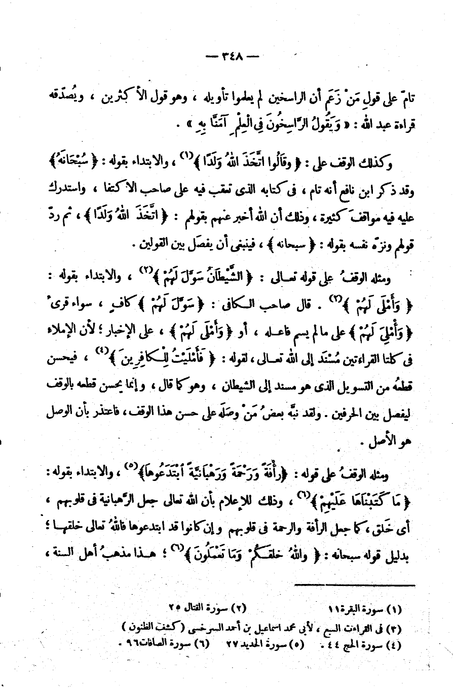 وَمِثْلُهُ الْوَقْفُ على قوله: {رأفة ورحمة ورهبانية ابتدعوها} وَالِابْتِدَاءُ بِقَوْلِهِ: {مَا كَتَبْنَاهَا عَلَيْهِمْ} وَذَلِكَ لِلْإِعْلَامِ بِأَنَّ اللَّهَ تَعَالَى جَعَلَ الرَّهْبَانِيَّةَ فِي قُلُوبِهِمْ أَيْ خَلَقَ كَمَا جَعَلَ الرَّأْفَةَ وَالرَّحْمَةَ فِي قُلُوبِهِمْ وَإِنْ كَانُوا قَدِ ابْتَدَعُوهَا فَاللَّهُ تَعَالَى خَلَقَهَا بِدَلِيلِ قَوْلِهِ سُبْحَانَهُ: {وَاللَّهُ خَلَقَكُمْ وَمَا تعملون} هَذَا مَذْهَبُ أَهْلِ السُّنَّةِ،