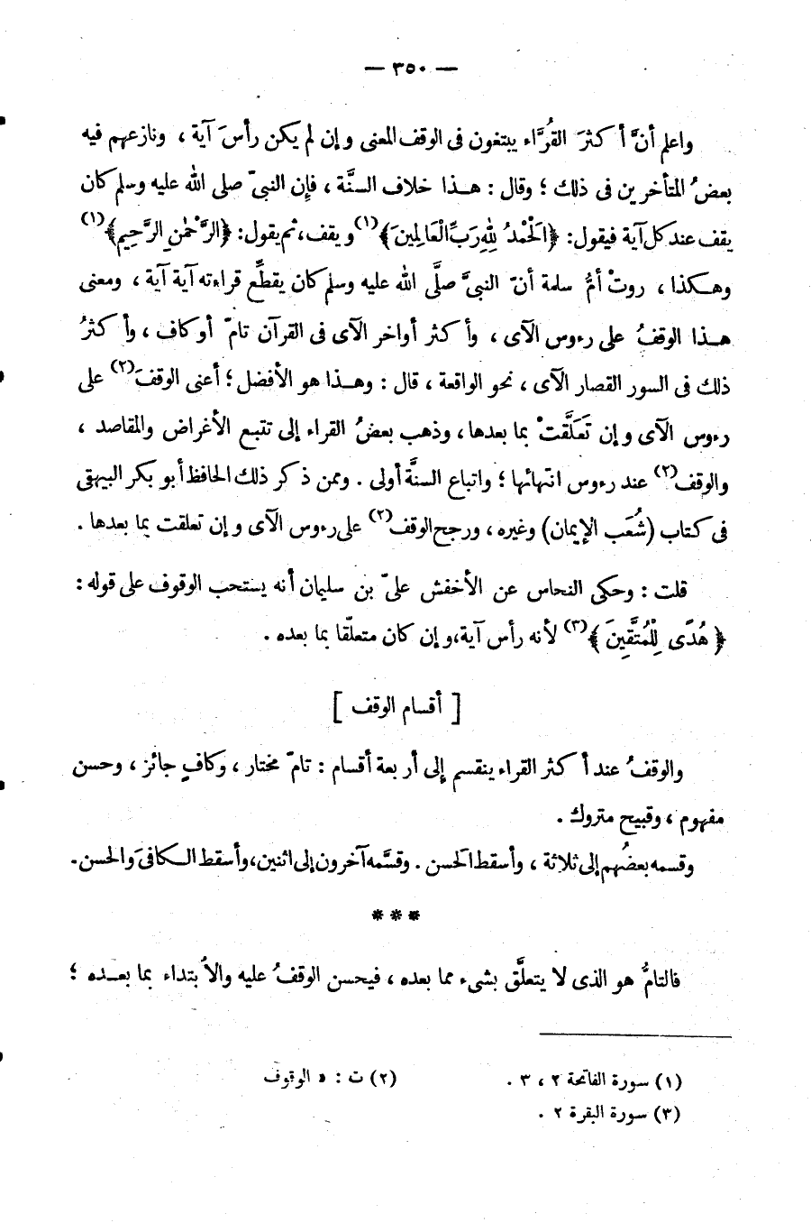 وَاعْلَمْ أَنَّ أَكْثَرَ الْقُرَّاءِ يَبْتَغُونَ فِي الْوَقْفِ الْمَعْنَى وَإِنْ لَمْ يَكُنْ رَأْسَ آيَةٍ وَنَازَعَهُمْ فيه بعض المتأخرين في ذلك وقال هَذَا خِلَافُ السُّنَّةِ فَإِنَّ النَّبِيَّ صَلَّى اللَّهُ عَلَيْهِ وَسَلَّمَ كَانَ يَقِفُ عِنْدَ كُلِّ آيَةٍ فيقول: {الحمد لله رب العالمين} ويقف ثم يقول: {الرحمن الرحيم} وَهَكَذَا رَوَتْ أَمُّ سَلَمَةَ أَنَّ النَّبِيَّ صَلَّى اللَّهُ عَلَيْهِ وَسَلَّمَ كَانَ يُقَطِّعُ قِرَاءَتَهُ آيَةً آيَةً