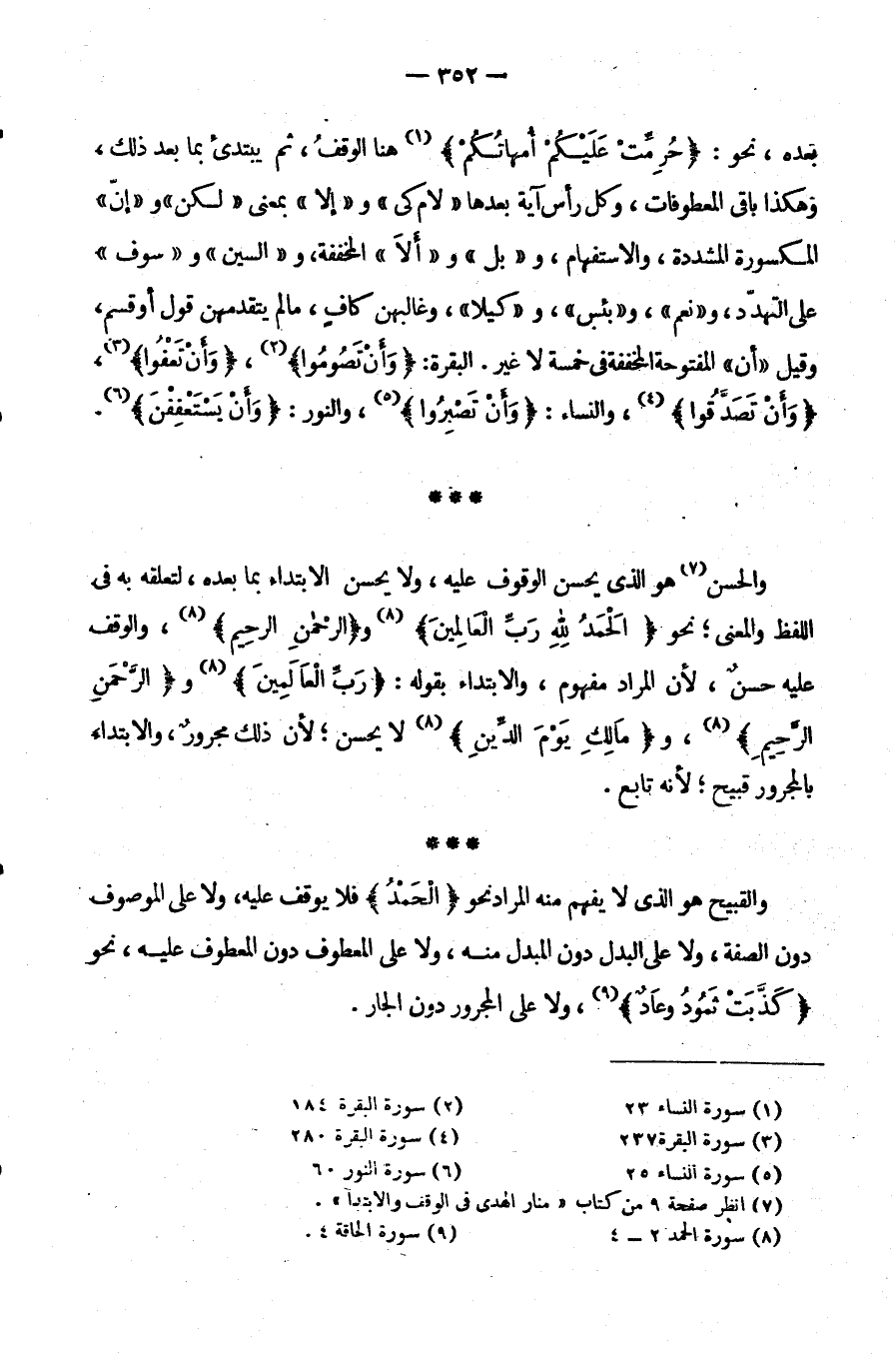 بعده نحو: {حرمت عليكم أمهاتكم} هُنَا الْوَقْفُ ثُمَّ يَبْتَدِئُ بِمَا بَعْدَ ذَلِكَ وَهَكَذَا بَاقِي الْمَعْطُوفَاتِ وَكُلُّ رَأْسِ آيَةٍ بَعْدَهَا لام كي وإلا بمعنى لكن وإن المكسورة المشددة والاستفهام وبل وألا المخففة والسين وسوف على التهدد ونعم وبئس وكيلا وَغَالِبُهُنَّ كَافٍ مَا لَمْ يَتَقَدَّمْهُنَّ قَوْلٌ أَوْ قَسَمٌ وَقِيلَ أَنْ الْمَفْتُوحَةُ الْمُخَفَّفَةُ فِي خَمْسَةٍ لا غير البقرة: {وأن تصوموا} {وأن تعفوا} {وأن تصدقوا} {والنساء} {وأن تصبروا} {والنور} {وأن يستعففن}