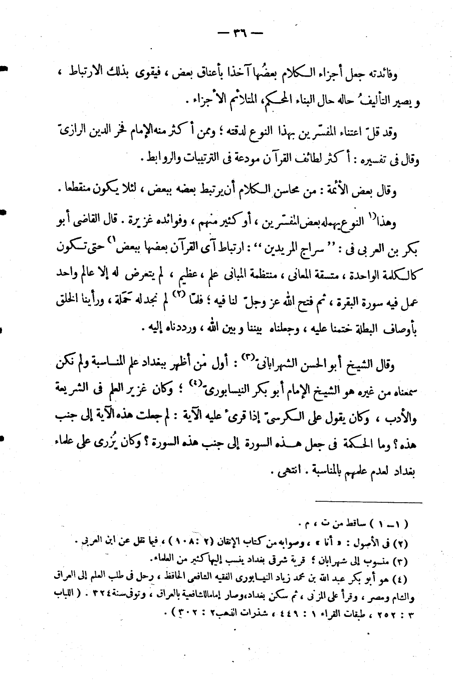 وقال الشيخ أبو الحسن الشهراباني أَوَّلُ مَنْ أَظْهَرَ بِبَغْدَادَ عِلْمَ الْمُنَاسَبَةِ وَلَمْ نَكُنْ سَمِعْنَاهُ مَنْ غَيْرِهِ هُوَ الشَّيْخُ الْإِمَامُ أَبُو بَكْرٍ النَّيْسَابُورِيُّ وَكَانَ غَزِيرَ الْعِلْمِ فِي الشَّرِيعَةِ وَالْأَدَبِ وَكَانَ يَقُولُ عَلَى الْكُرْسِيِّ إِذَا قرئ عليه الآية لِمَ جُعِلَتْ هَذِهِ الْآيَةُ إِلَى جَنْبِ هَذِهِ؟ وَمَا الْحِكْمَةُ فِي جَعْلِ هَذِهِ السُّورَةِ إِلَى جَنْبِ هَذِهِ السُّورَةِ؟ وَكَانَ يُزْرِي عَلَى عُلَمَاءِ بَغْدَادَ لِعَدَمِ عِلْمِهِمْ بِالْمُنَاسَبَةِ انْتَهَى