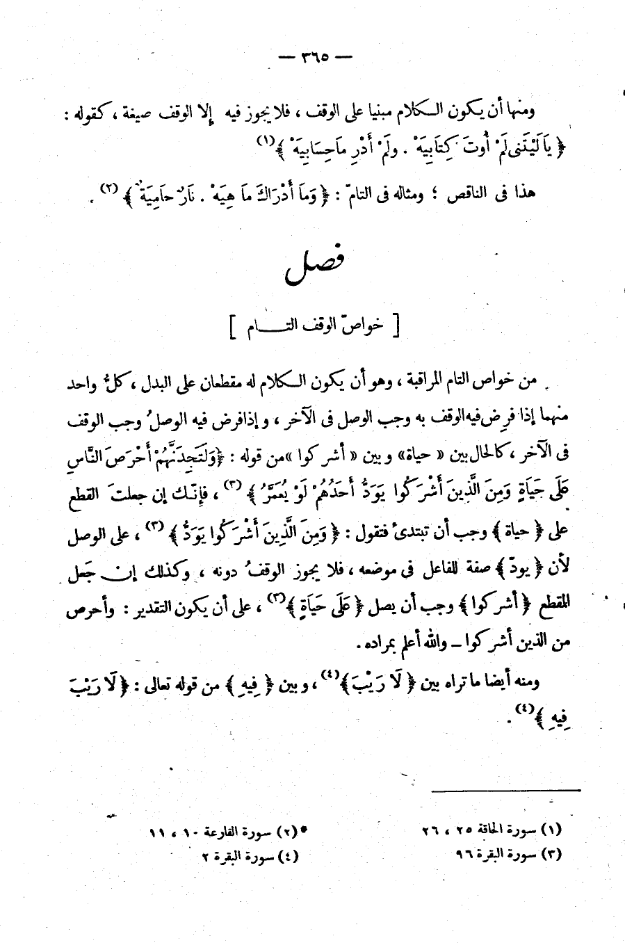 مِنْ خَوَاصِّ التَّامِّ الْمُرَاقَبَةُ وَهُوَ أَنْ يَكُونَ الْكَلَامُ لَهُ مَقْطَعَانِ عَلَى الْبَدَلِ كُلُّ وَاحِدٍ منهما إذا فرض فيه وَجَبَ الْوَصْلُ فِي الْآخَرِ وَإِذَا فُرِضَ فِيهِ الْوَصْلُ وَجَبَ الْوَقْفُ فِي الْآخَرِ كَالْحَالِ بَيْنَ حَيَاةٍ وَبَيْنَ أَشْرَكُوا مِنْ قَوْلِهِ: {وَلَتَجِدَنَّهُمْ أَحْرَصَ النَّاسِ عَلَى حَيَاةٍ وَمِنَ الَّذِينَ أَشْرَكُوا يَوَدُّ أحدهم لو يعمر} ، فَإِنَّكَ إِنْ جَعَلْتَ الْقَطْعَ عَلَى {حَيَاةٍ} وَجَبَ أَنْ تَبْتَدِئَ فَتَقُولَ: {وَمِنَ الَّذِينَ أَشْرَكُوا يَوَدُّ} عَلَى الْوَصْلِ لِأَنَّ {يَوَدُّ} صِفَةٌ لِلْفَاعِلِ فِي مَوْضِعِهِ فَلَا يَجُوزُ الْوَقْفُ دُونَهُ وَكَذَلِكَ إِنْ جَعَلَ الْمَقْطَعَ {أَشْرَكُوا} وَجَبَ أَنْ يَصِلَ {عَلَى حَيَاةٍ} عَلَى أَنْ يَكُونَ التَّقْدِيرُ وَأَحْرَصَ مِنَ الَّذِينَ أَشْرَكُوا وَاللَّهُ أَعْلَمُ بِمُرَادِهِ