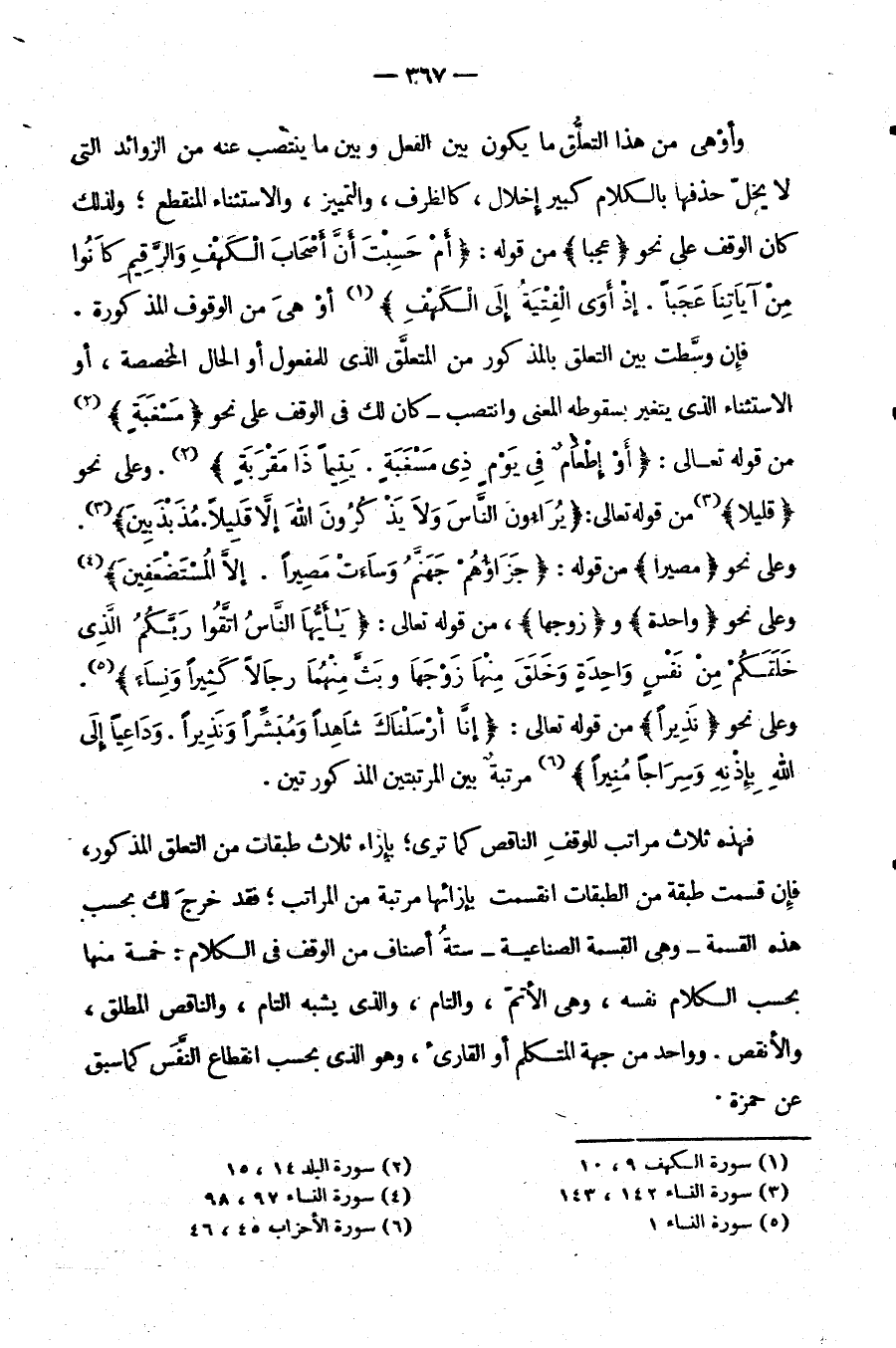 فَهَذِهِ ثَلَاثُ مَرَاتِبَ لِلْوَقْفِ النَّاقِصِ كَمَا تَرَى بِإِزَاءِ ثَلَاثِ طَبَقَاتٍ مِنَ التَّعَلُّقِ الْمَذْكُورِ فَإِنْ قَسَّمْتَ طَبَقَةً مِنَ الطَّبَقَاتِ انْقَسَمَتْ بِإِزَائِهَا مَرْتَبَةٌ مِنَ الْمَرَاتِبِ فَقَدْ خَرَجَ لَكَ بِحَسَبِ هَذِهِ الْقِسْمَةِ وَهِيَ الْقِسْمَةُ الصِّنَاعِيَّةُ سِتَّةُ أَصْنَافٍ مِنَ الْوَقْفِ فِي الْكَلَامِ خَمْسَةٌ مِنْهَا بِحَسَبِ الْكَلَامِ نَفْسِهِ وَهِيَ الْأَتَمُّ وَالتَّامُّ وَالَّذِي يُشْبِهُ التَّامَّ وَالنَّاقِصُ الْمُطْلَقُ وَالْأَنْقَصُ وَوَاحِدٌ مِنْ جِهَةِ الْمُتَكَلِّمِ أَوِ الْقَارِئِ وَهُوَ الَّذِي بِحَسَبِ انْقِطَاعِ النَّفَسِ كَمَا سَبَقَ عَنْ حمزة