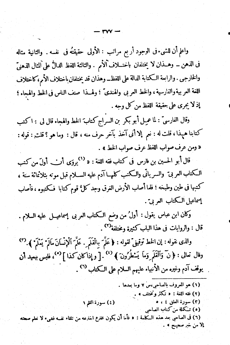 وَاعْلَمْ أَنَّ لِلشَّيْءِ فِي الْوُجُودِ أَرْبَعَ مَرَاتِبَ: الْأُولَى حَقِيقَتُهُ فِي نَفْسِهِ وَالثَّانِيَةُ مِثَالُهُ فِي الذِّهْنِ وَهَذَانِ لَا يَخْتَلِفَانِ بِاخْتِلَافِ الْأُمَمِ وَالثَّالِثَةُ اللَّفْظُ الدَّالُّ عَلَى الْمِثَالِ الذِّهْنِيِّ وَالْخَارِجِيِّ وَالرَّابِعَةُ الْكِتَابَةُ الدَّالَّةُ عَلَى اللَّفْظِ وَهَذَانِ قَدْ يَخْتَلِفَانِ بِاخْتِلَافِ الْأُمَمِ كَاخْتِلَافِ اللُّغَةِ الْعَرَبِيَّةِ وَالْفَارِسِيَّةِ وَالْخَطِّ الْعَرَبِيِّ وَالْهِنْدِيِّ وَلِهَذَا صَنَّفَ النَّاسُ فِي الْخَطِّ وَالْهِجَاءِ إِذْ لَا يَجْرِي عَلَى حَقِيقَةِ اللَّفْظِ مِنْ كُلِّ وَجْهٍ