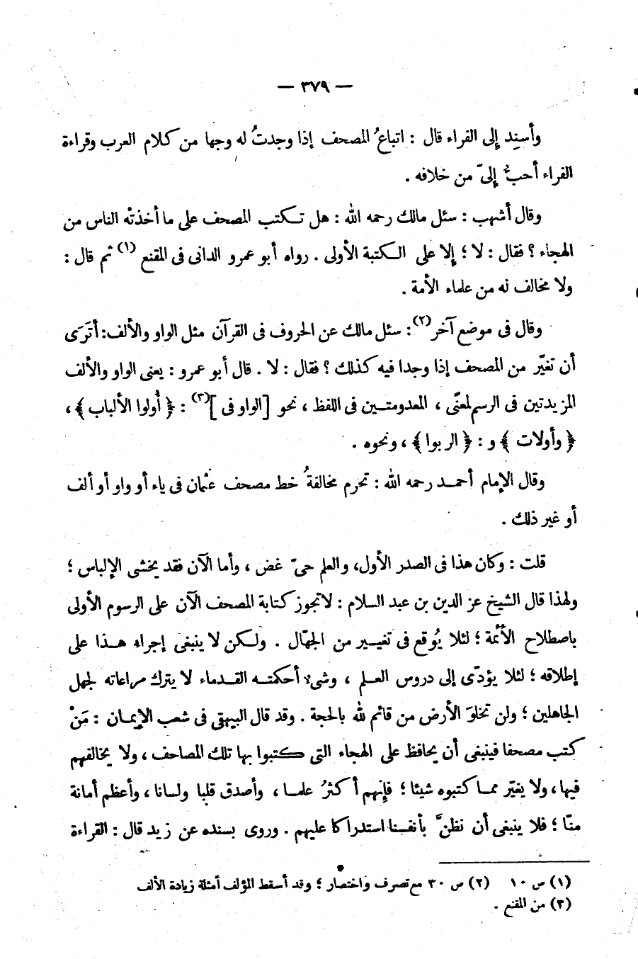 وَقَالَ فِي مَوْضِعٍ آخَرَ سُئِلَ مَالِكٌ عَنِ الْحُرُوفِ فِي الْقُرْآنِ مِثْلِ الْوَاوِ وَالْأَلِفِ أَتَرَى أَنْ تُغَيَّرَ مِنَ الْمُصْحَفِ إِذَا وُجِدَا فِيهِ كَذَلِكَ فَقَالَ لَا قَالَ أَبُو عَمْرٍو يَعْنِي الْوَاوَ وَالْأَلِفَ الْمَزِيدَتَيْنِ فِي الرَّسْمِ لِمَعْنًى الْمَعْدُومَتَيْنِ فِي اللَّفْظِ نَحْوُ الواو في {أولو الألباب} {وأولات} و {الربوا} وَنَحْوِهِ