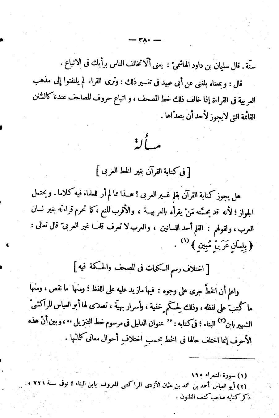 واعلم أن الخط جرى على وجوه فيها ما زيد عليه عَلَى اللَّفْظِ وَمِنْهَا مَا نَقَصَ وَمِنْهَا مَا كُتِبَ عَلَى لَفْظِهِ وَذَلِكَ لِحِكَمٍ خَفِيَّةٍ وَأَسْرَارٍ بَهِيَّةٍ تَصَدَّى لَهَا أَبُو الْعَبَّاسِ الْمُرَّاكِشِيُّ الشَّهِيرُ بِابْنِ الْبَنَّاءِ فِي كِتَابِهِ عُنْوَانُ الدَّلِيلِ فِي مَرْسُومِ خَطِّ التَّنْزِيلِ وَبَيَّنَ أَنَّ هَذِهِ الْأَحْرُفَ إِنَّمَا اخْتَلَفَ حَالُهَا فِي الْخَطِّ بِحَسَبِ اخْتِلَافِ أَحْوَالِ مَعَانِي كَلِمَاتِهَا