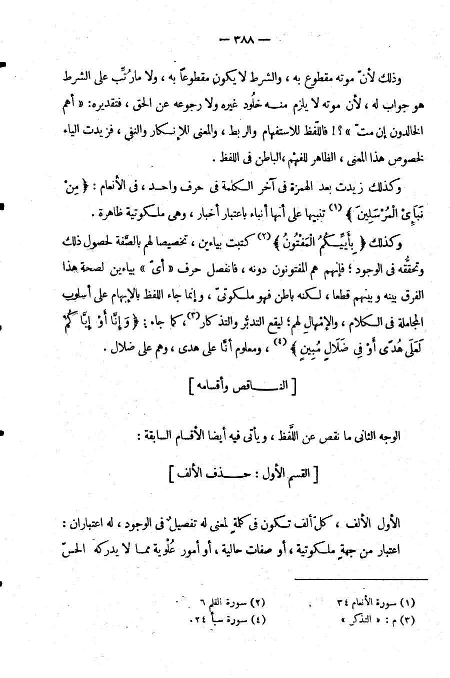 الْأَوَّلُ الْأَلِفُ كُلُّ أَلِفٍ تَكُونُ فِي كَلِمَةٍ لِمَعْنًى لَهُ تَفْصِيلٌ فِي الْوُجُودِ لَهُ اعْتِبَارَانِ اعْتِبَارٌ مِنْ جِهَةٍ مَلَكُوتِيَّةٍ أَوْ صِفَاتٍ حَالِيَّةٍ أَوْ أُمُورٍ عُلْوِيَّةٍ مِمَّا لَا يُدْرِكُهُ الْحِسُّ
