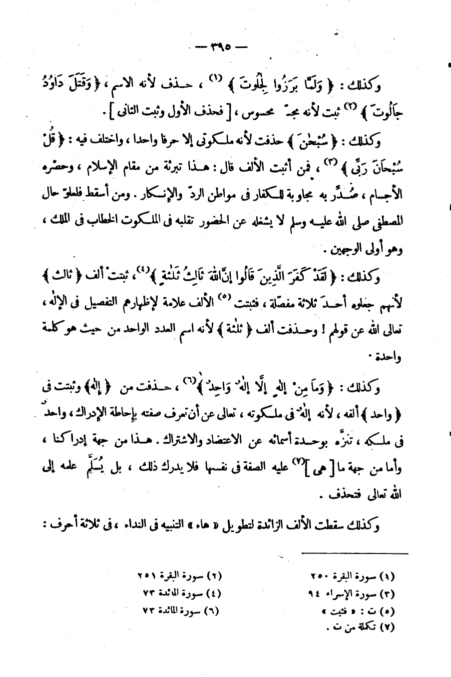 وَكَذَلِكَ: {لَقَدْ كَفَرَ الَّذِينَ قَالُوا إِنَّ اللَّهَ ثَالِثُ ثلثة} ثَبَتَتْ أَلِفُ {ثَالِثُ} لِأَنَّهُمْ جَعَلُوهُ أَحَدَ ثَلَاثَةٍ مُفَصَّلَةٍ فَثَبَتَتِ الْأَلِفُ عَلَامَةً لِإِظْهَارِهِمُ التَّفْصِيلَ فِي الْإِلَهِ تَعَالَى اللَّهُ عَنْ قَوْلِهِمْ وَحُذِفَتْ أَلِفُ: {ثَلَثَةٍ} لِأَنَّهُ اسْمُ الْعَدَدِ الْوَاحِدِ مِنْ حَيْثُ هُوَ كَلِمَةٌ وَاحِدَةٌ وَكَذَلِكَ: {وَمَا مِنْ إِلَهٍ إلا إله واحد} حُذِفَتْ مِنْ {إِلَهٍ} وَثَبَتَتْ فِي {وَاحِدٌ} أَلِفُهُ لِأَنَّهُ إِلَهٌ فِي مَلَكُوتِهِ تَعَالَى عَنْ أَنْ تُعْرَفَ صِفَتُهُ بِإِحَاطَةِ الْإِدْرَاكِ وَاحِدٌ فِي مُلْكِهِ تَنَزَّهَ بِوَحْدَةِ أَسْمَائِهِ عَنِ الِاعْتِضَادِ وَالِاشْتِرَاكِ هَذَا مِنْ جِهَةِ إِدْرَاكِنَا وَأَمَّا مِنْ جِهَةِ مَا هِيَ