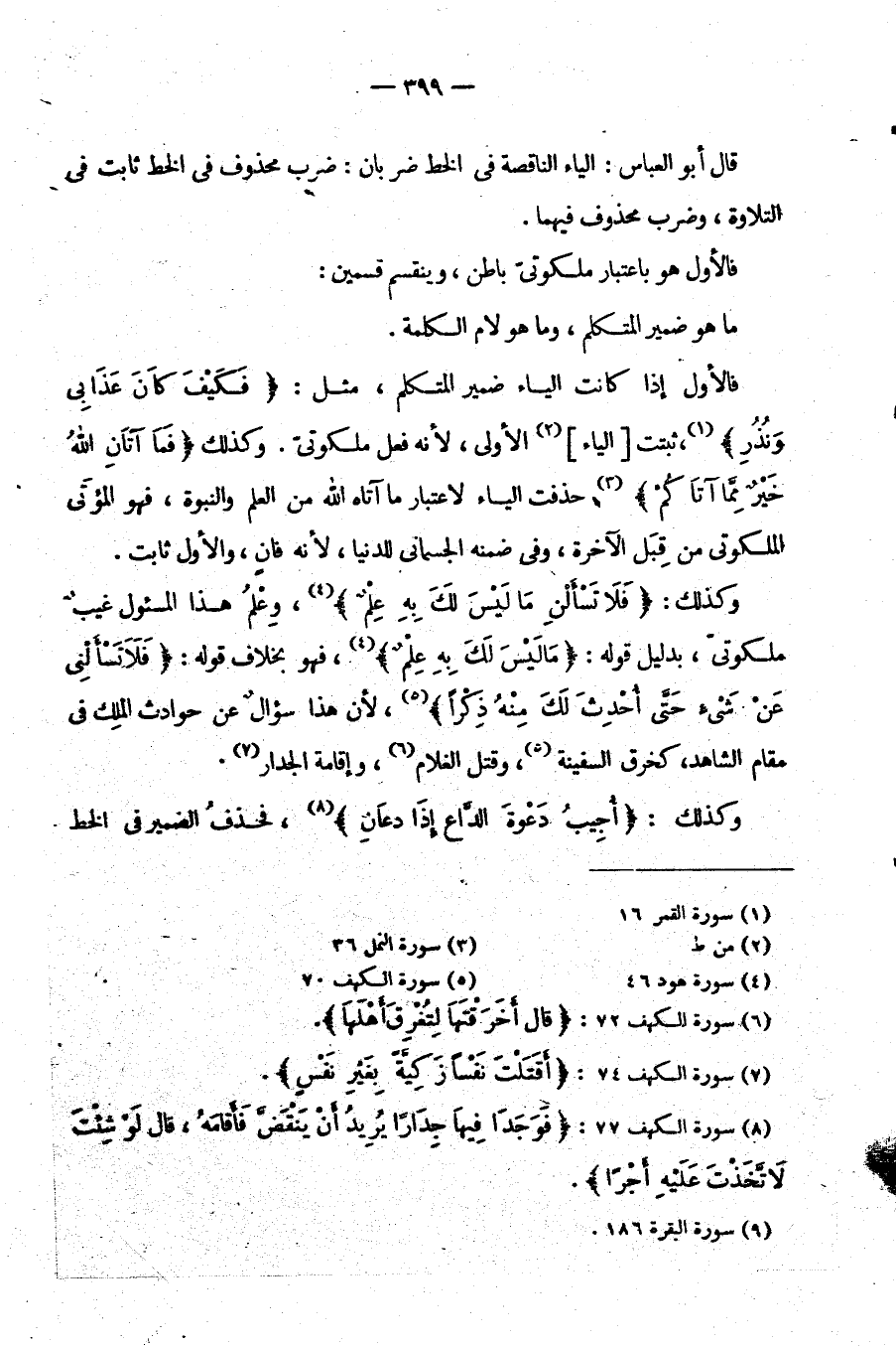 قَالَ أَبُو الْعَبَّاسِ: الْيَاءُ النَّاقِصَةُ فِي الْخَطِّ ضَرْبَانِ ضَرْبٌ مَحْذُوفٌ فِي الْخَطِّ ثَابِتٌ فِي التِّلَاوَةِ وَضَرْبٌ مَحْذُوفٌ فِيهِمَا.