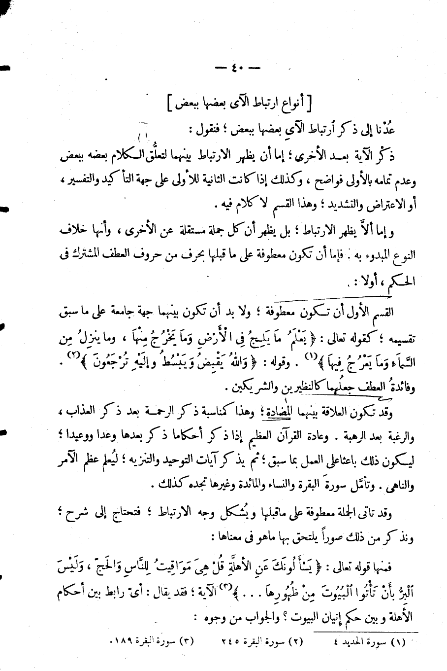 عُدْنَا إِلَى ذِكْرِ ارْتِبَاطِ الْآيِ بَعْضِهَا بِبَعْضٍ فَنَقُولُ ذِكْرُ الْآيَةِ بَعْدَ الْأُخْرَى إِمَّا أَنْ يَظْهَرَ الِارْتِبَاطُ بَيْنَهُمَا لِتَعَلُّقِ الْكَلَامِ بَعْضِهِ بِبَعْضٍ وَعَدَمِ تَمَامِهِ بِالْأُولَى فَوَاضِحٌ وَكَذَلِكَ إِذَا كَانَتِ الثَّانِيَةُ لِلْأُولَى عَلَى جِهَةِ التَّأْكِيدِ وَالتَّفْسِيرِ أَوِ الِاعْتِرَاضِ وَالتَّشْدِيدِ وَهَذَا الْقِسْمُ لَا كَلَامَ فِيهِ