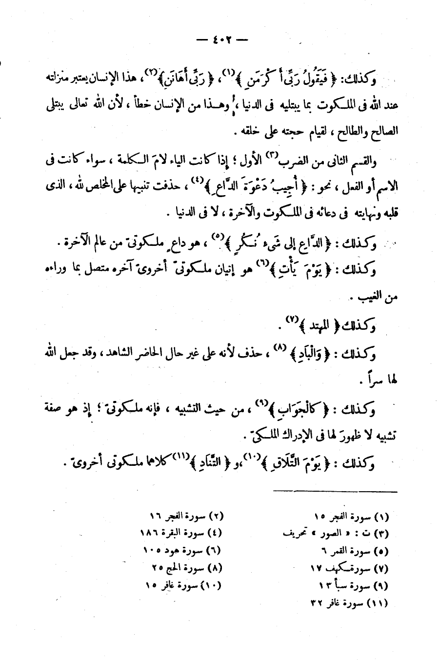 وَالْقِسْمُ الثَّانِي: مِنَ الضَّرْبِ الْأَوَّلِ إِذَا كَانَتِ الْيَاءُ لَامَ الْكَلِمَةِ سَوَاءٌ كَانَتْ فِي الِاسْمِ أَوِ الْفِعْلِ نحو: {أجيب دعوة الداع} حُذِفَتْ تَنْبِيهًا عَلَى الْمُخْلِصِ لِلَّهِ الَّذِي قَلْبُهُ وَنِهَايَتُهُ فِي دُعَائِهِ فِي الْمَلَكُوتِ وَالْآخِرَةِ لَا فِي الدُّنْيَا