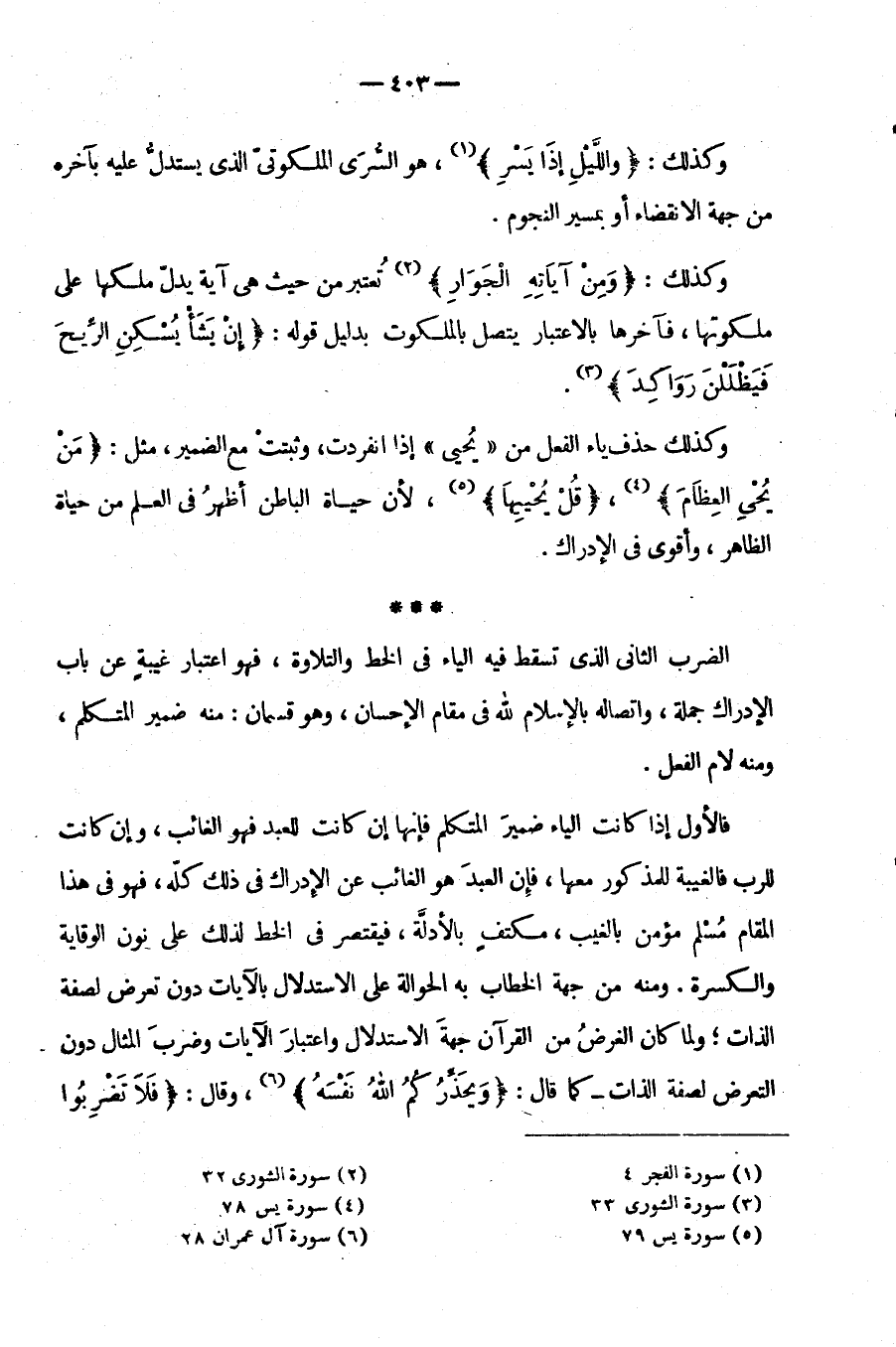 الضَّرْبُ الثَّانِي: الَّذِي تَسْقُطُ فِيهِ الْيَاءُ فِي الْخَطِّ وَالتِّلَاوَةِ فَهُوَ اعْتِبَارُ غَيْبَةٍ عَنْ بَابِ الْإِدْرَاكِ جُمْلَةً وَاتِّصَالُهُ بِالْإِسْلَامِ لِلَّهِ فِي مَقَامِ الْإِحْسَانِ وَهُوَ قِسْمَانِ مِنْهُ ضَمِيرُ الْمُتَكَلِّمِ وَمِنْهُ لَامُ الْفِعْلِ